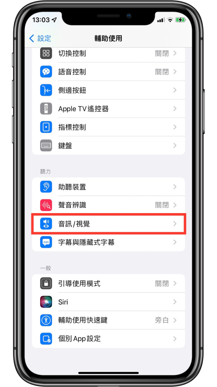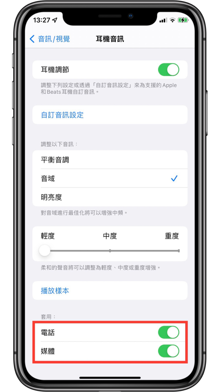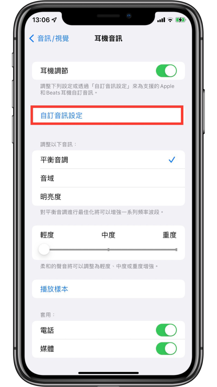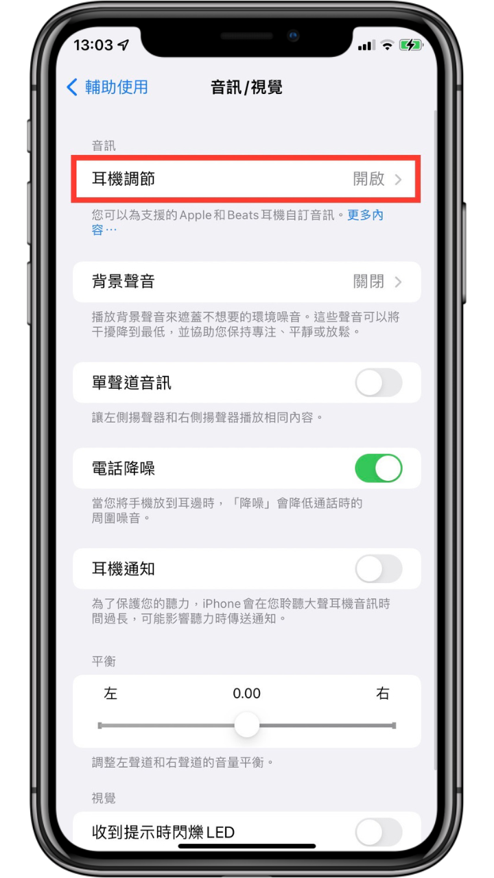 開啟「設定」-> 點選「輔助使用」-> 選擇聽力欄位中的「音訊/視覺」-> 點選「耳機調節」-> 開啟「耳機調節」。