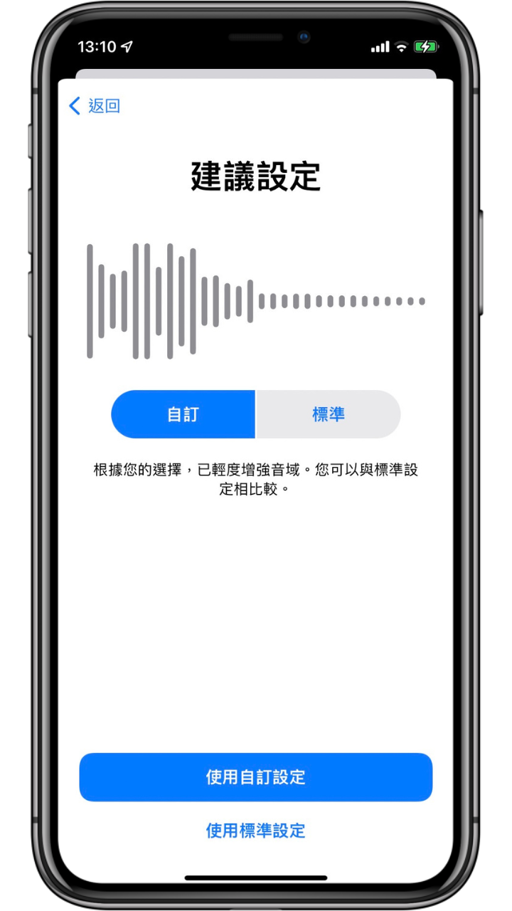 開啟耳機調節後,可點擊進入「自訂音訊設定」(注意:此時需戴上耳機進行設定,並且待在一個安靜的環境)