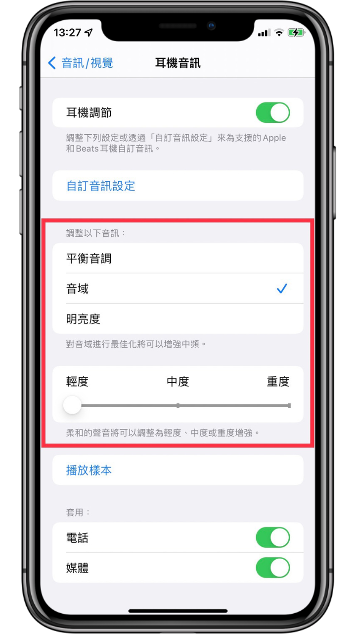 設定完自訂音訊後回到耳機音訊的頁面,下方選項也能夠對於音訊有些微的調整,或是調整聲音的柔和度,如果想要聽聽看調整過後的音訊效果,也可以點擊「播放樣本」。