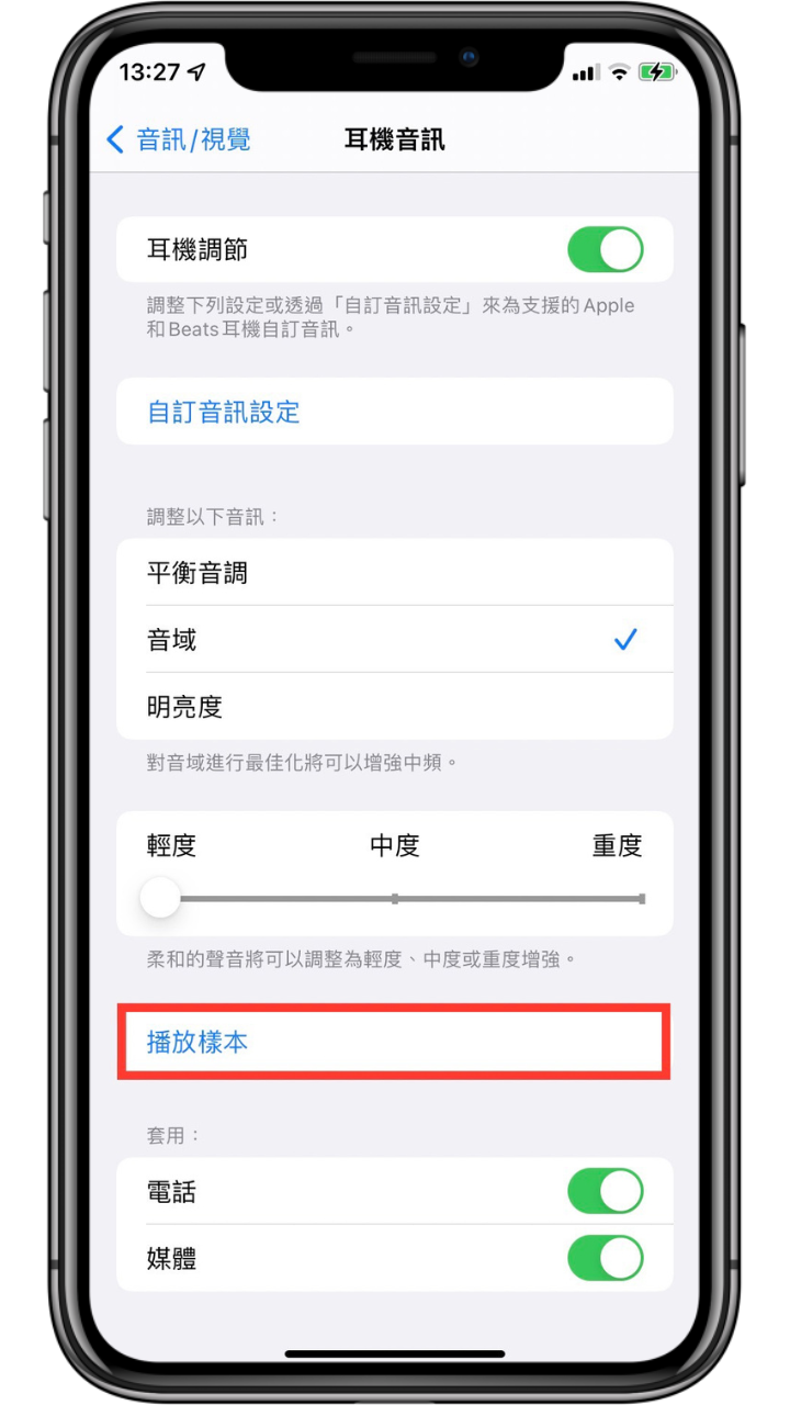 最下方也可以選擇所要套用的音訊,如果想要知道電話音訊與媒體音訊的差異,也可看之前介紹 iPhone 手機各個不同音量設定的差異。