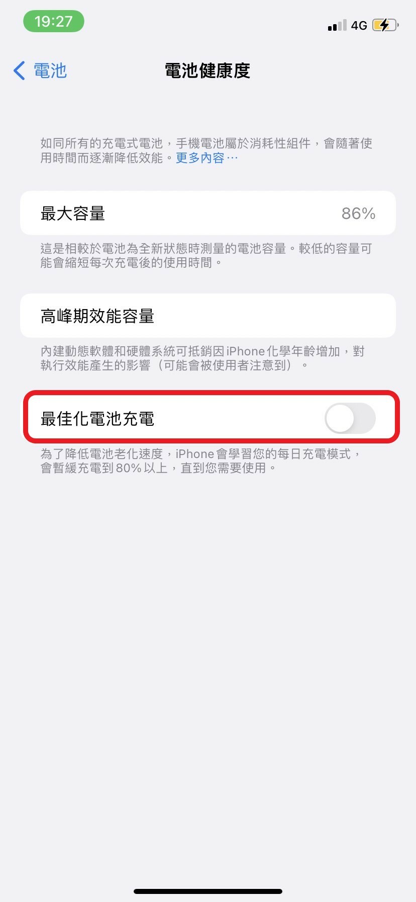 六、暫時關閉「最佳化充電」