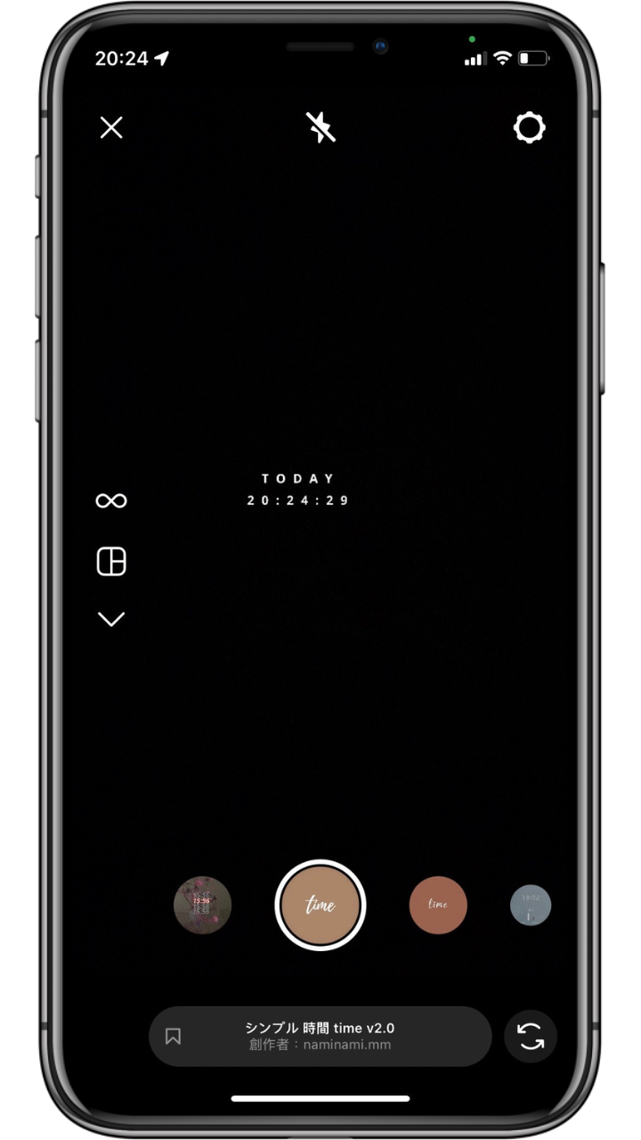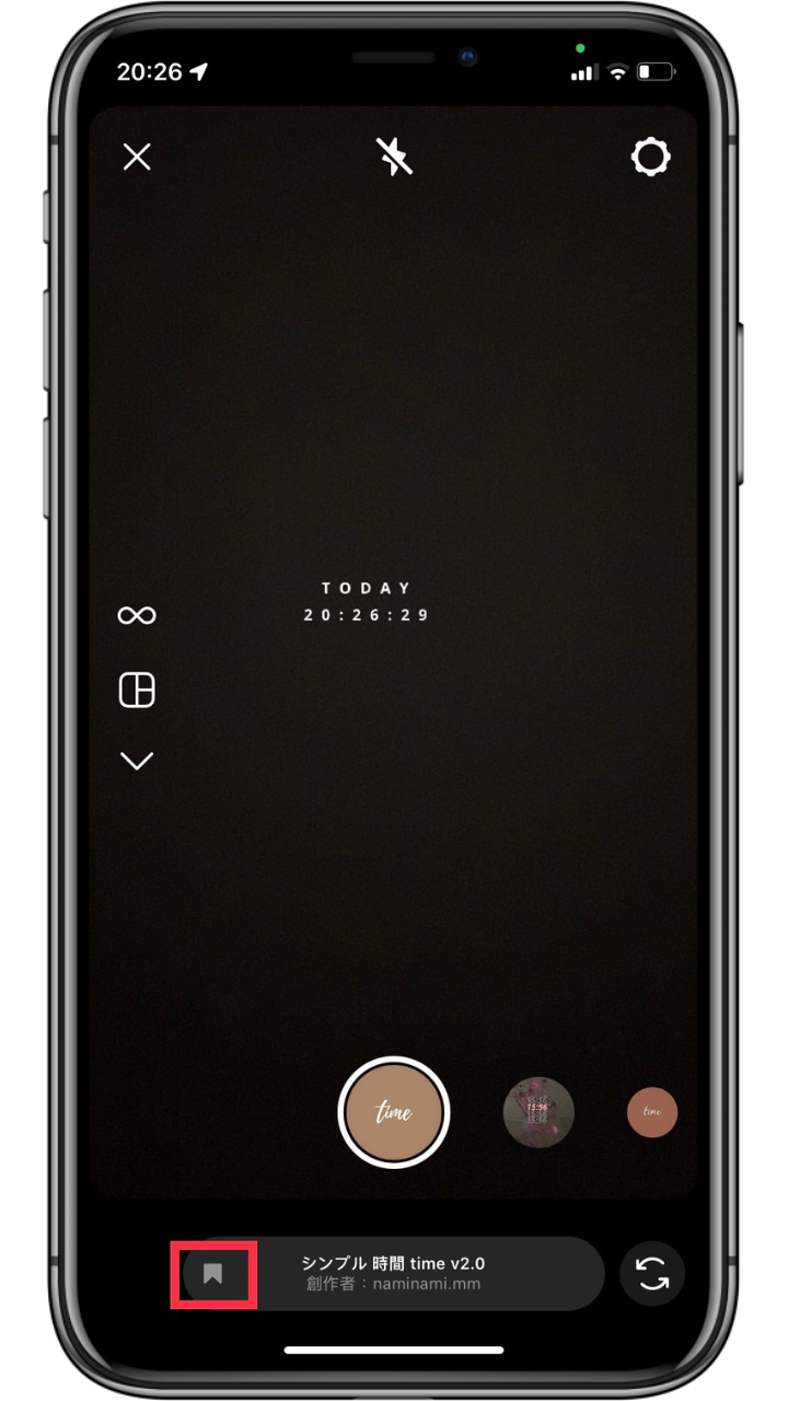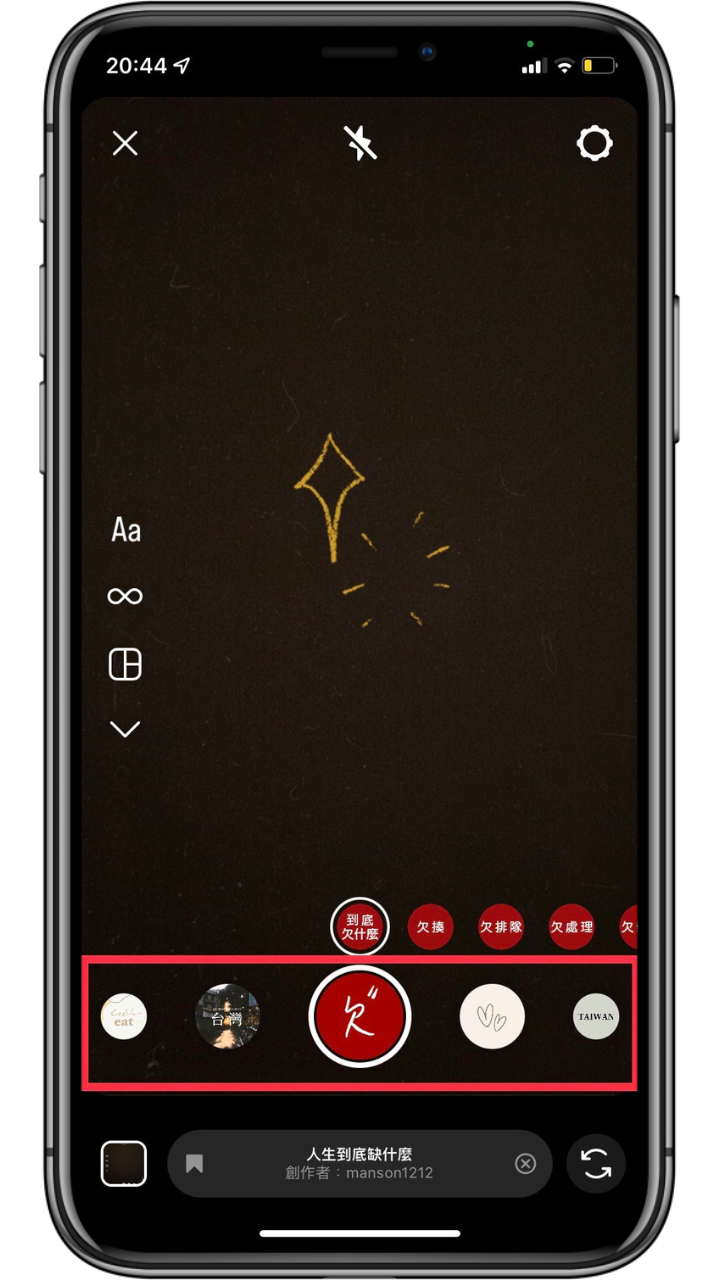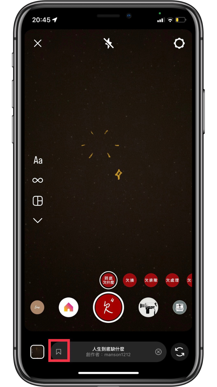 進到建立限時動態頁面後,滑動底部特效名稱,只要特效名稱左方標籤為實心狀態,就是已經儲存的特效。