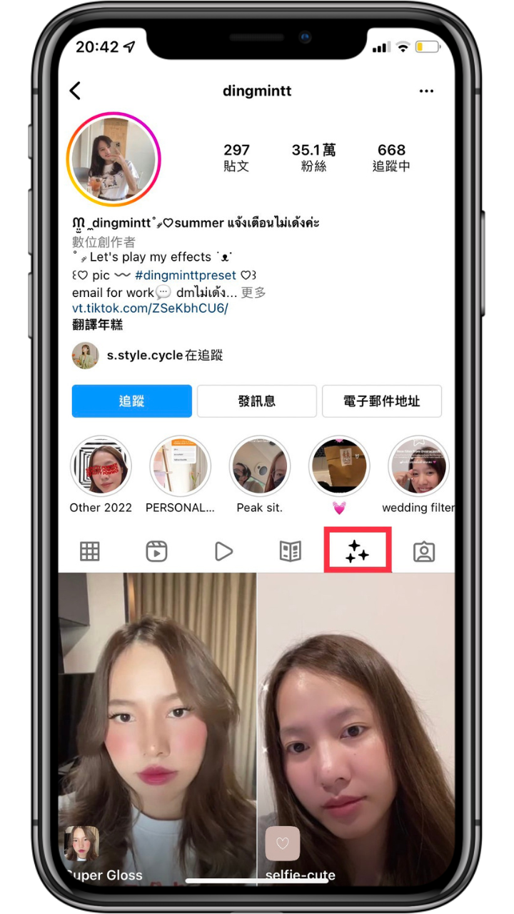 Instagram支援讓創作者製作特效並且上傳給他人使用,如果想要利用創作者瀏覽IG特效,只要進到創作者的IG個人檔案頁面,切換至「特效分頁」,就可以看到此創作者的個人特效,並且可以直接套用特效