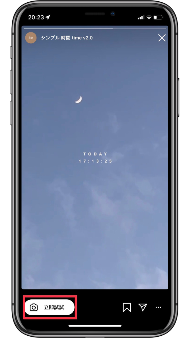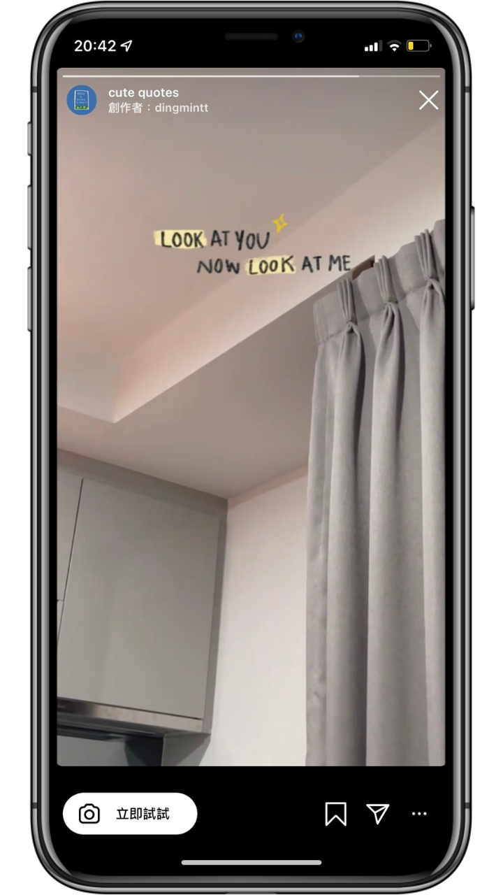 如果找到喜歡的特效點擊進去後,點選左下方立即試試,就可以立馬幫你跳至建立限時動態頁面,並且幫你套用特效,這樣使用者就可以直接使用這個特效建立限時動態。