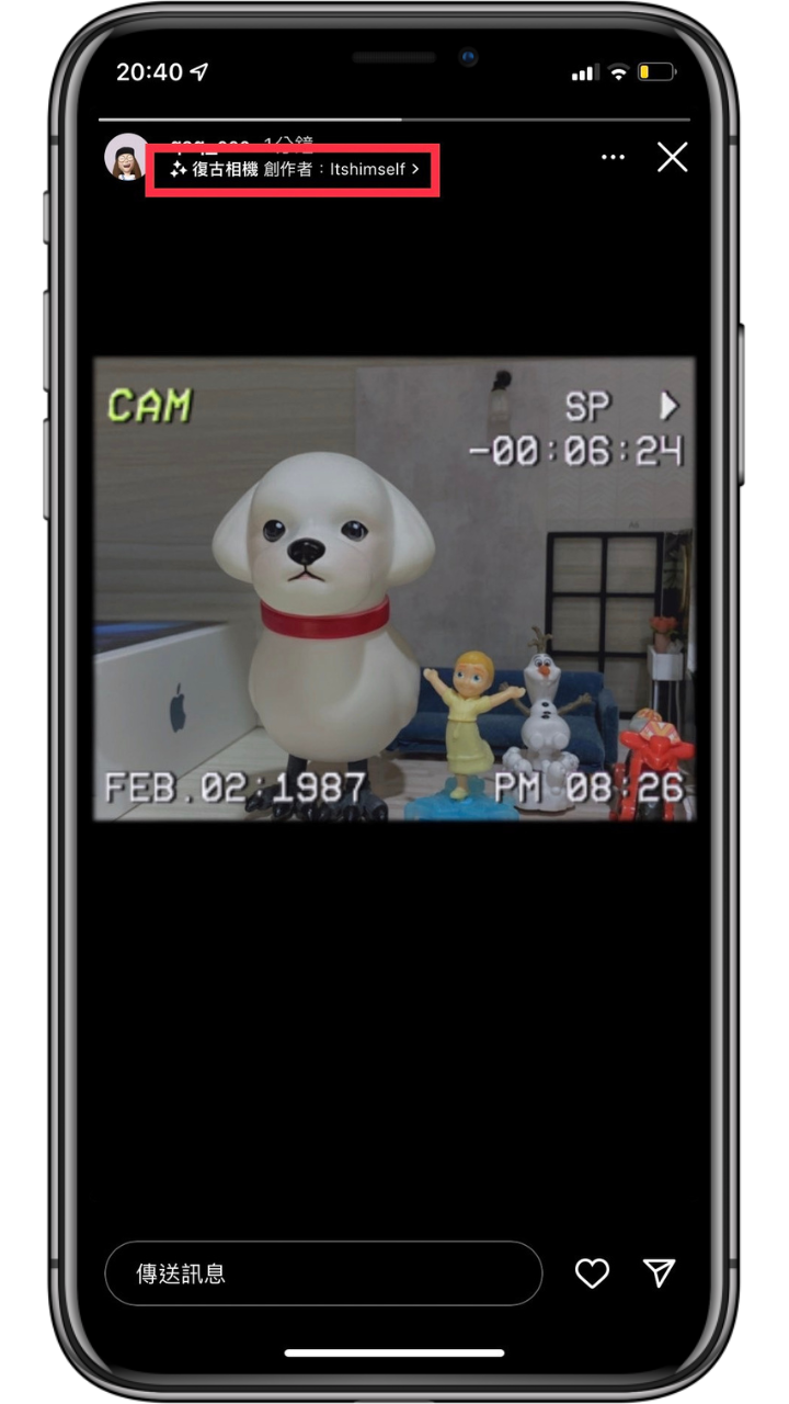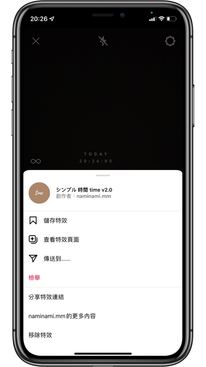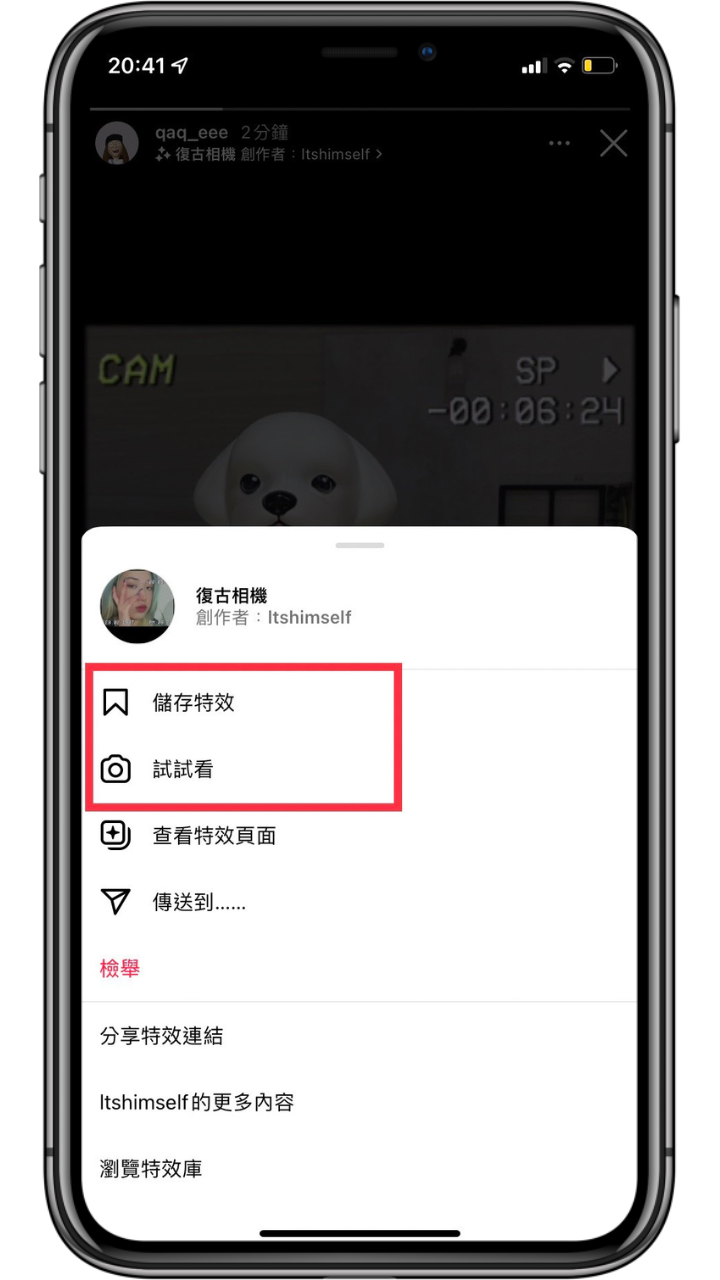 當你在別人的限時動態看到喜歡的特效十,就可以點擊左上角,使用者帳號的下方的一串文字,就會出現動作對話框,就可以針對自己想要的動作去執行。