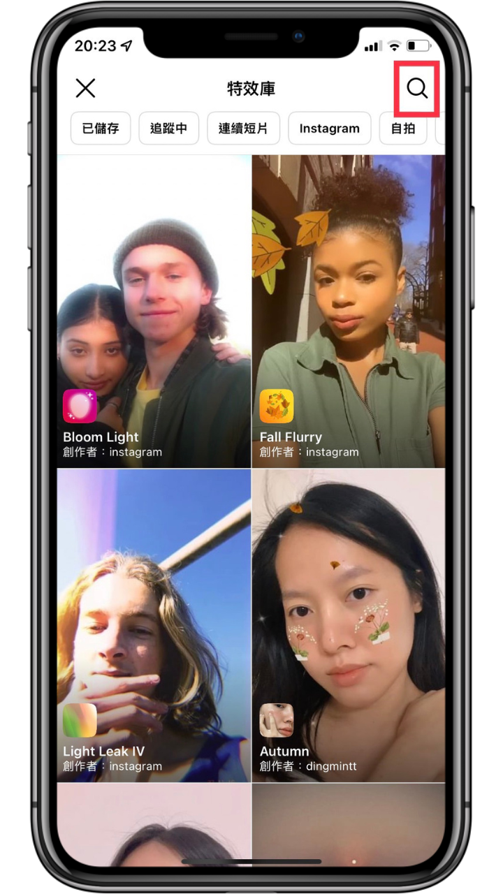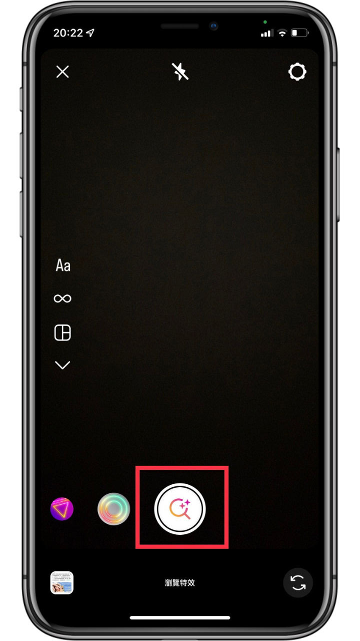 如果今天想要使用一些新的特效,可以打開建立IG限時動態的畫面,下方一排顯示的就是你目前擁有的特效,滑至最右邊即可看到「瀏覽特效」並點擊他,就可以開啟特效庫,在這裡就可以查看所有的創作者特效。
