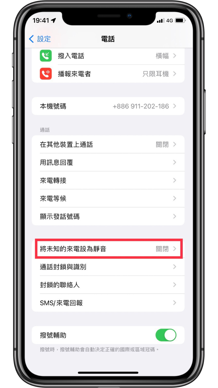 開啟「設定」->「電話」-> 點選「將未知的來電設為靜音」-> 開啟「將未知的來電設為靜音」。