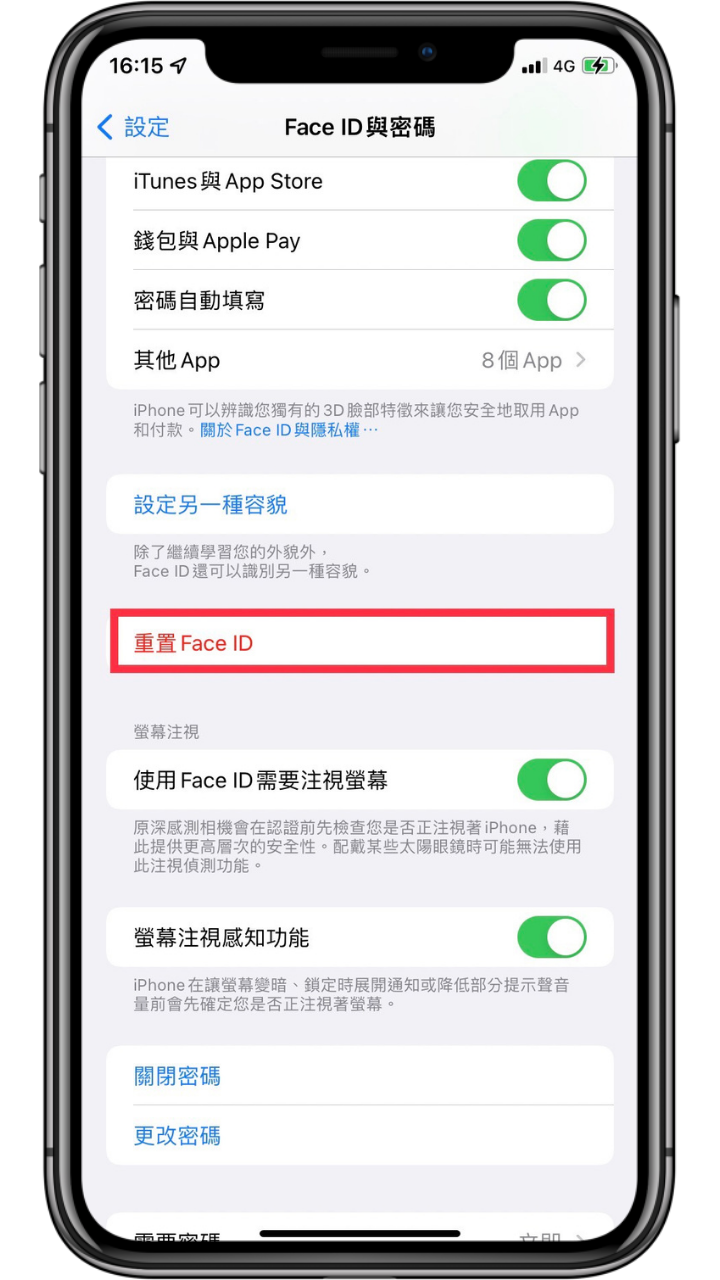 iOS「設定」-> 點選「Face ID 和密碼」-> 點擊「重置 Face ID」。