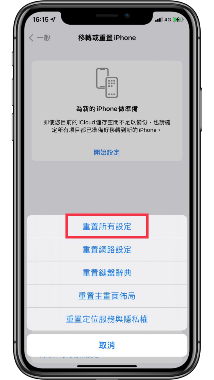 開啟「設定」-> 點選「一般」-> 點選「移轉或重置 iPhone 」-> 點擊下方「重置」按鈕 -> 選擇「重置所有設定」即可。
