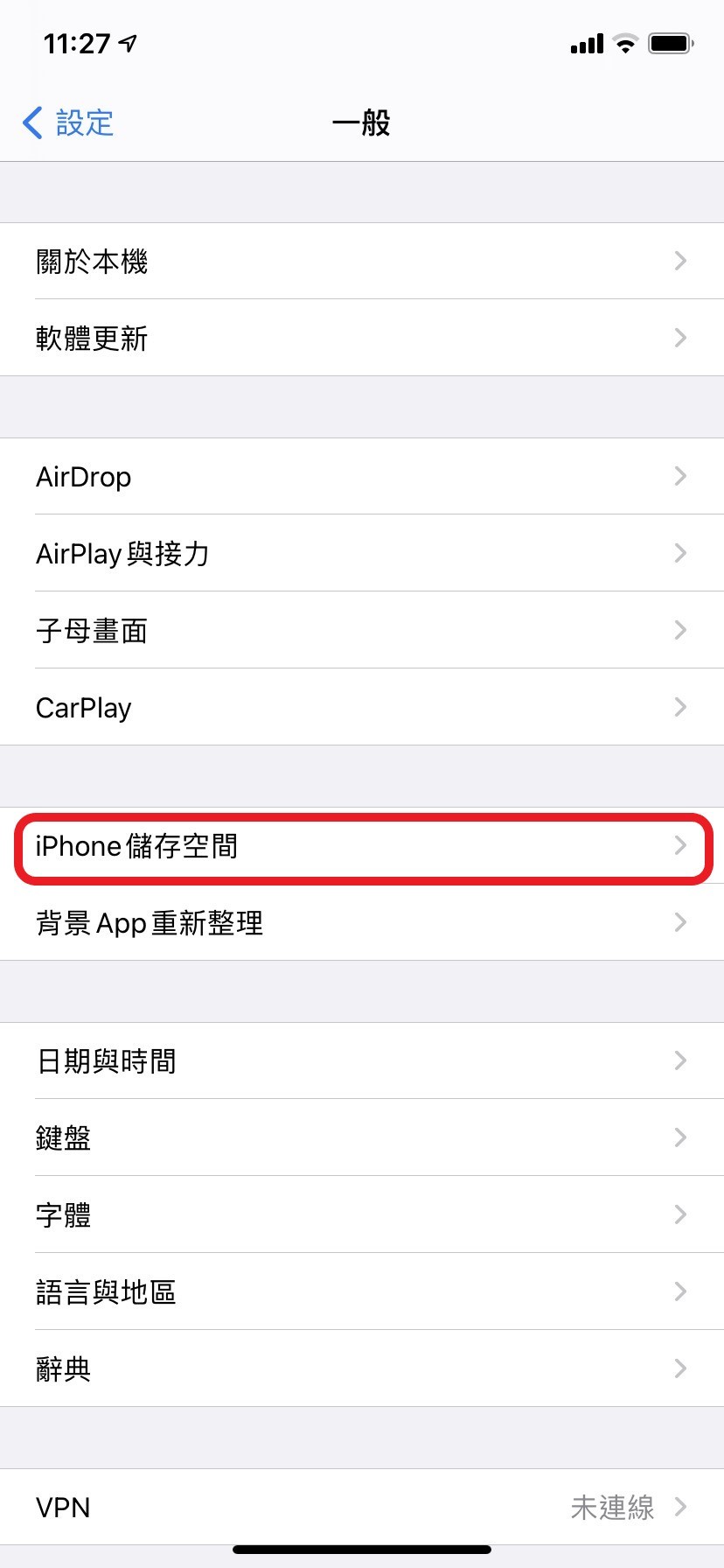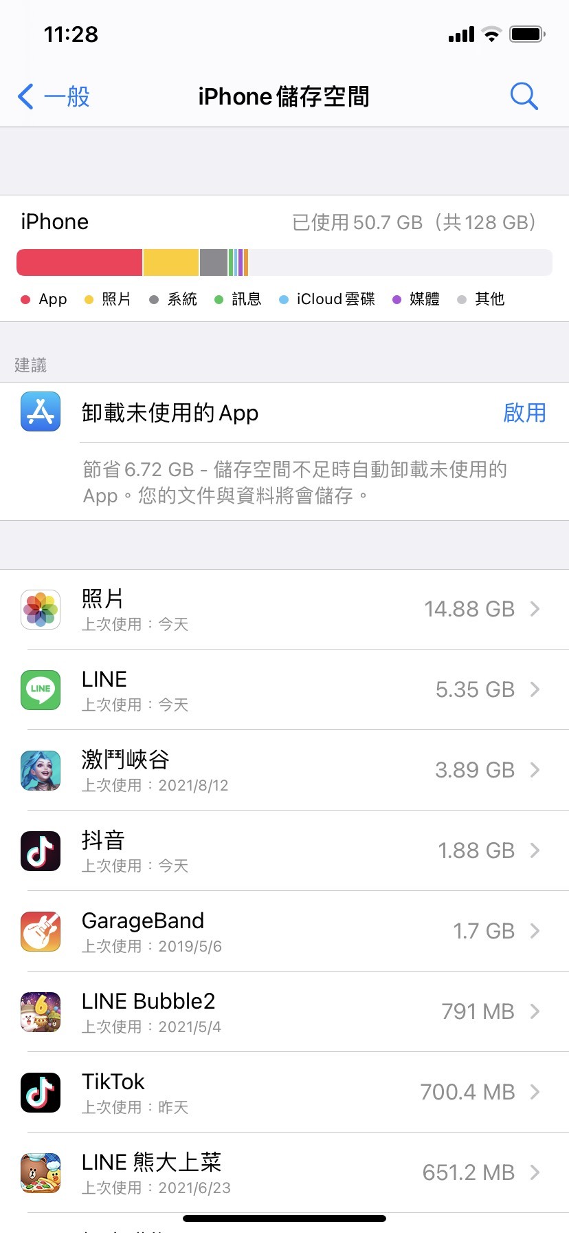 「設定」->「一般」->「iPhone儲存空間」