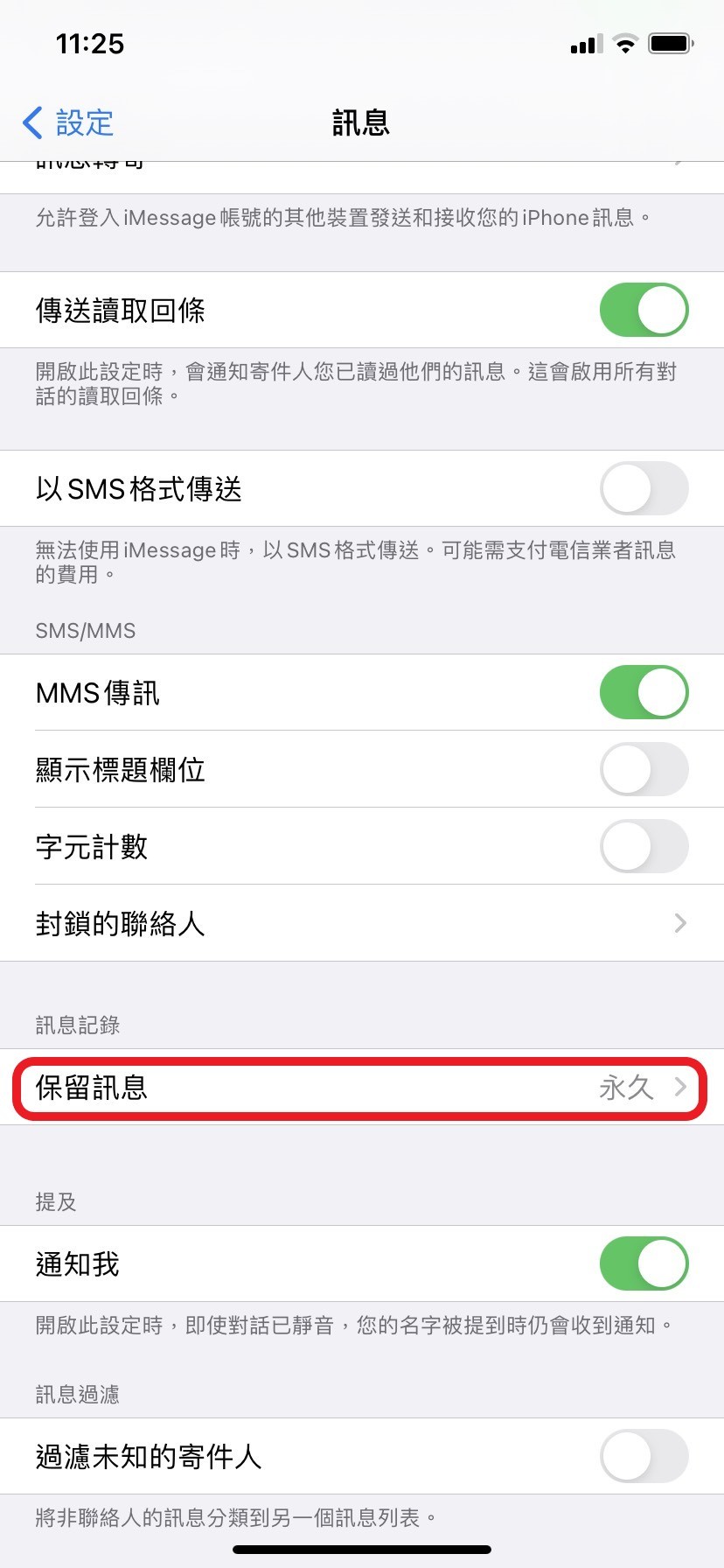 「設定」->「訊息」->「保留訊息」