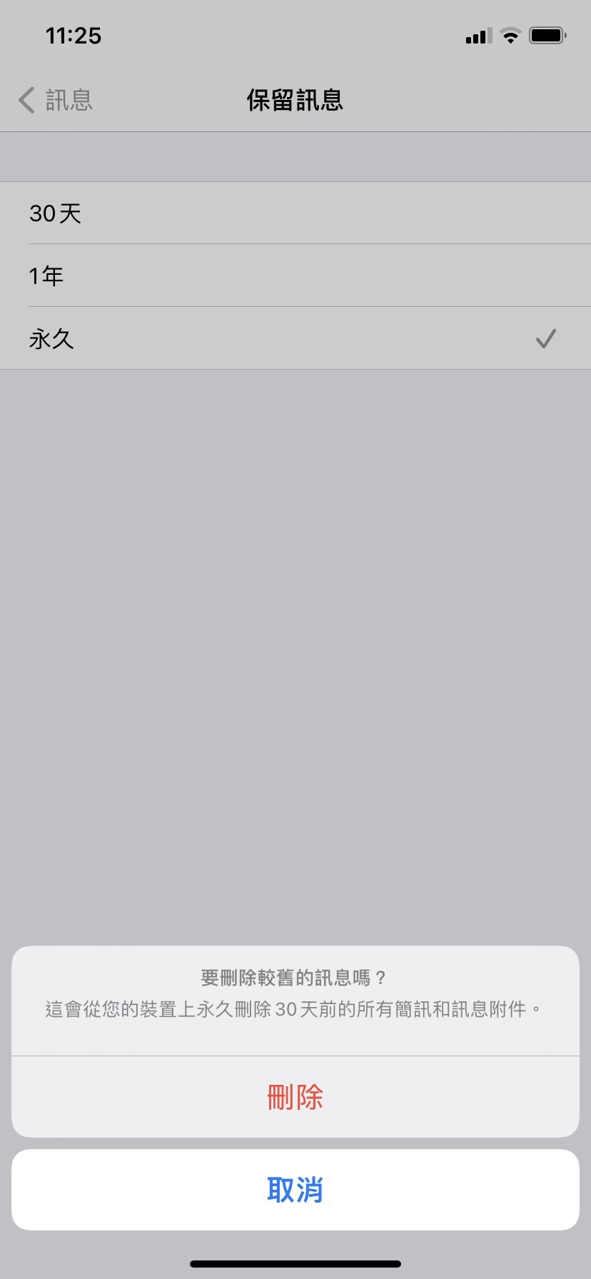 如果將時間設為「30天」則系統就會將30天前的訊息全部刪除。