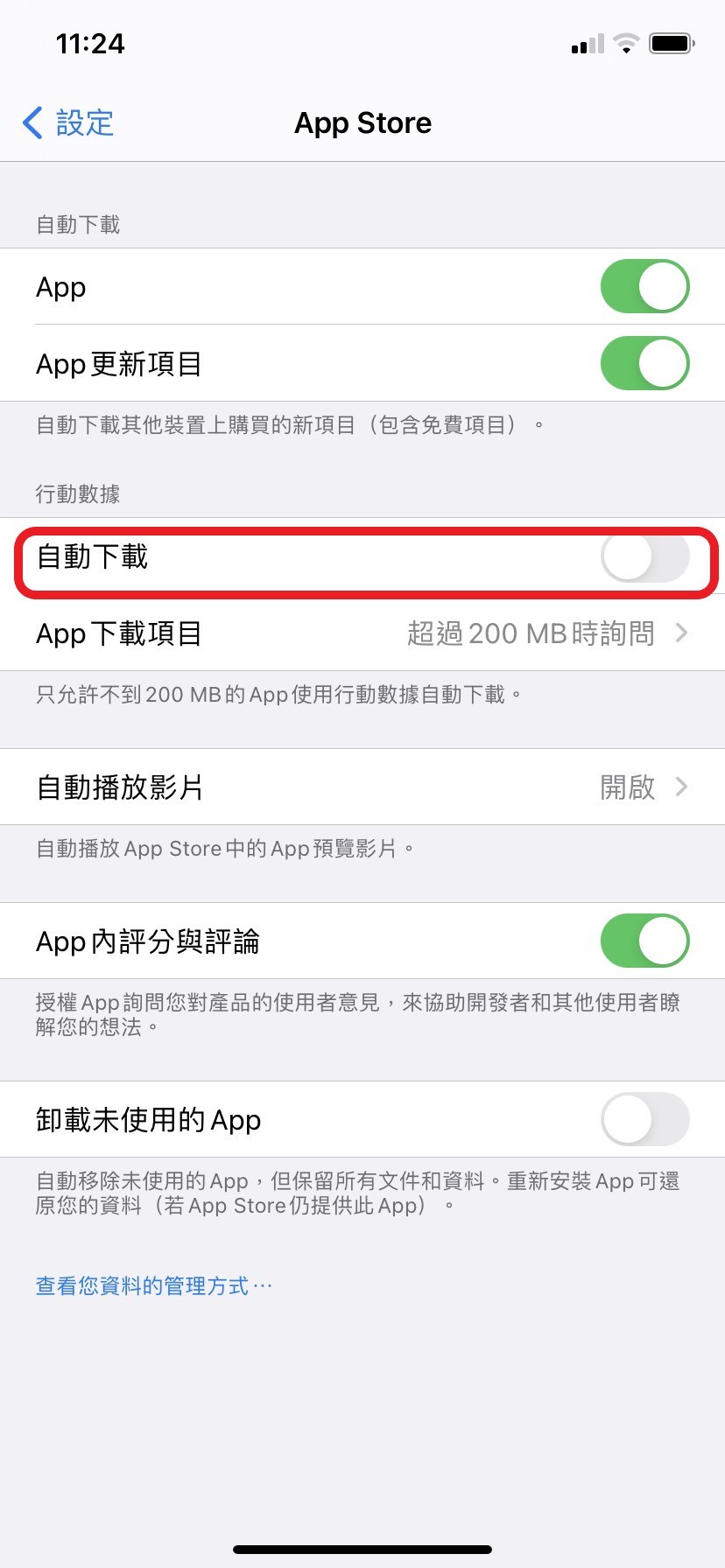「設定」->「iTunes與App Store」->關閉「自動下載」