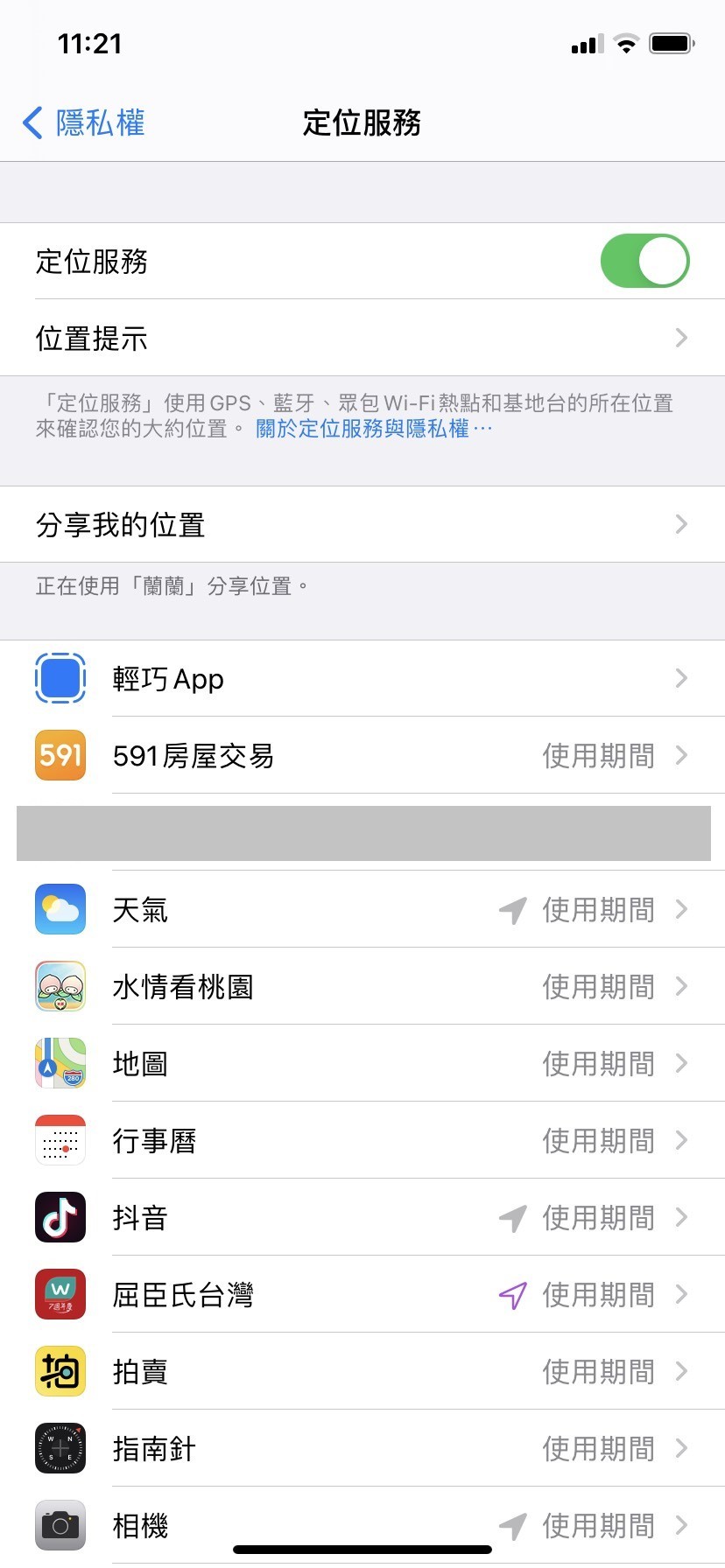 到這個頁面之後,可以依照每個APP的使用情況,來更改定位服務的設定,也可以關閉上方的定位服務,所有APP就不能取用你的定位服務。