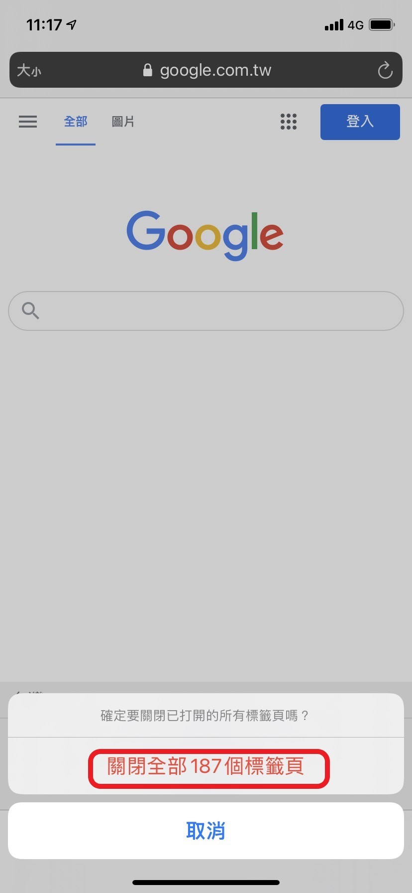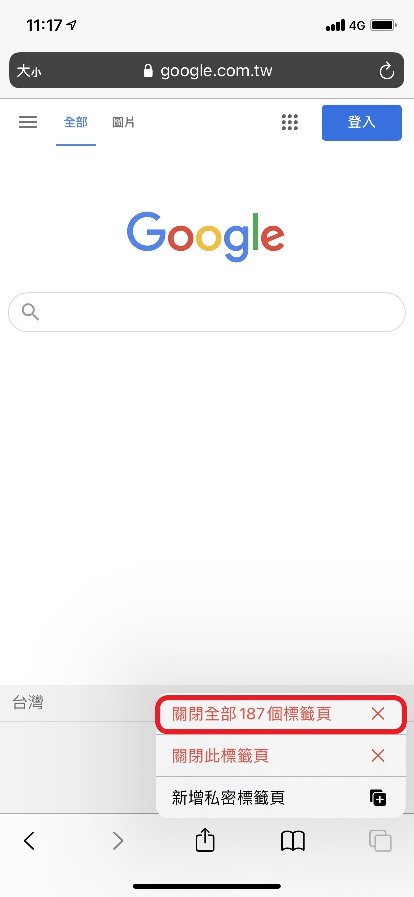 打開「Safari瀏覽器」->長按右下角圖示->點選「關閉XX個標籤頁」,就可以一次關閉所有標籤頁。