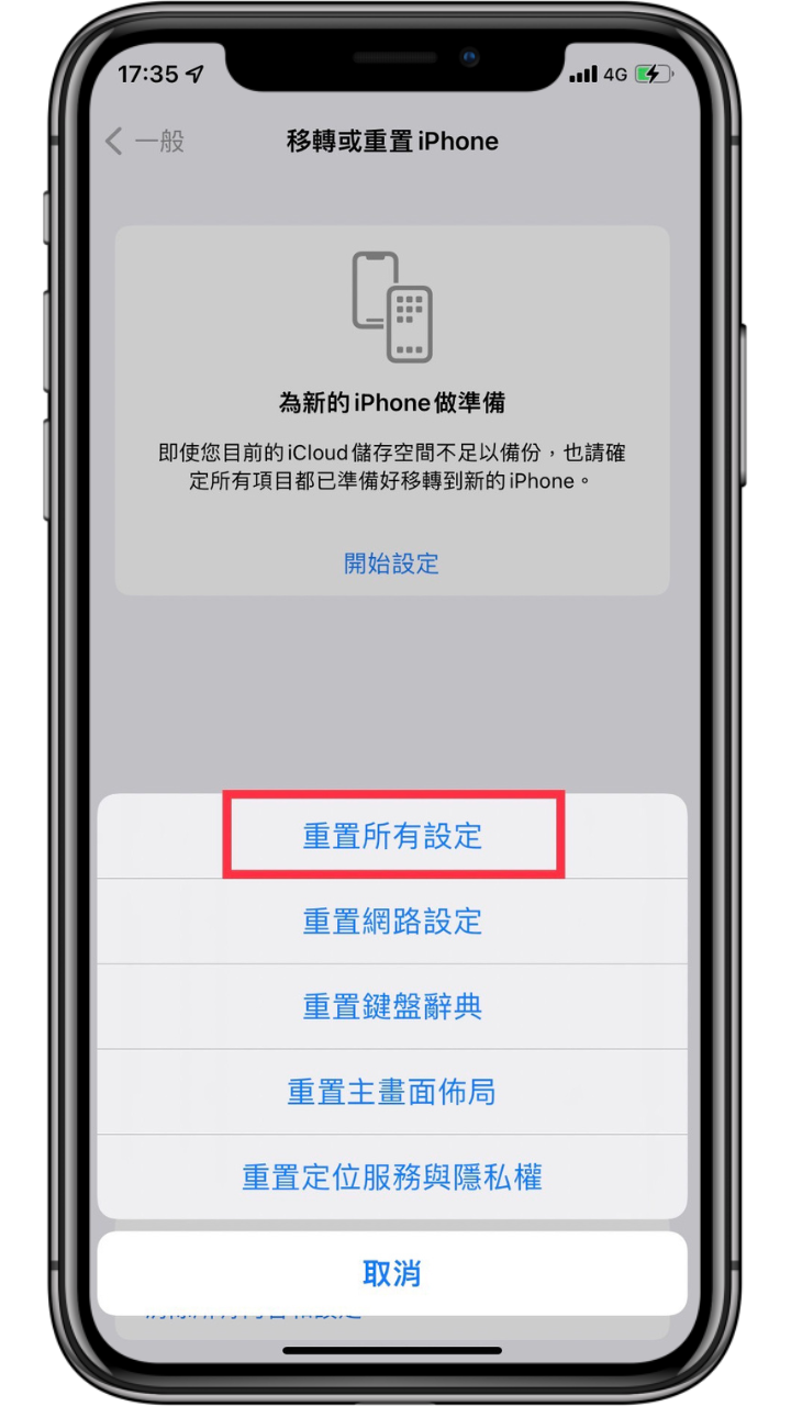 「設定」->「一般」->「移轉或重置 iPhone」->「重置」->「重置所有設定」。