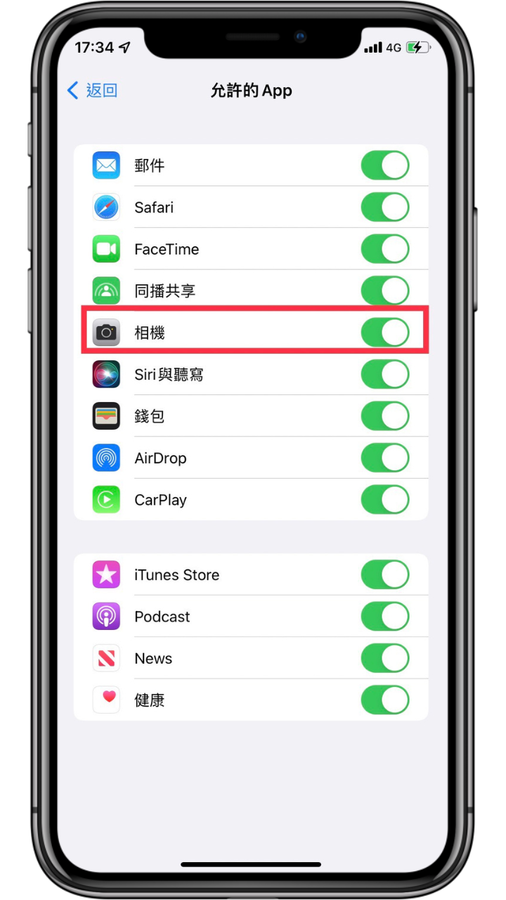 「設定」->「螢幕使用時間」->「內容與隱私權限制」-> 點選「允許的 App」,確認相機APP是否有開啟,在開啟狀態才能確保相機APP在限制之外。