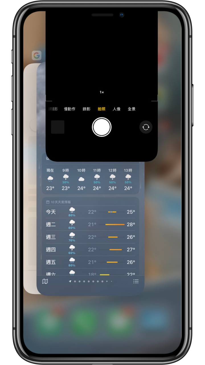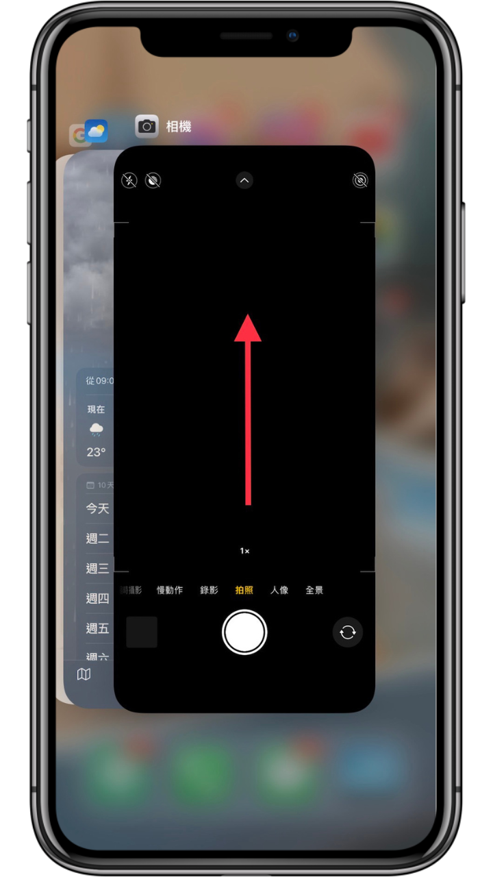 如果方法一無效時,就可以試試看這個方法,先開啟APP切換器後,將相機APP向上滑,強制退出相機APP之後再重新開啟,大部分都能暫時解決黑屏問題。