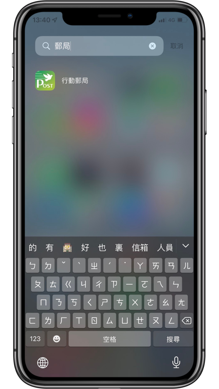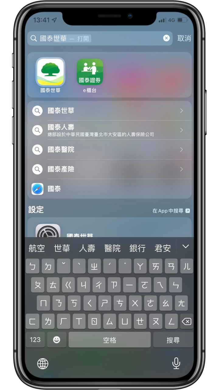 除了方法一可搜尋到被隱藏的 APP 之外,我們也可以利用 Spotlight 搜尋功能來找到我們要的 APP,只要在 iPhone 主畫面往下滑,就會出現 Spotlight 搜尋功能的頁面,一樣只要在搜尋欄內輸入 APP 名稱,下方就會出現 APP 搜尋結果。