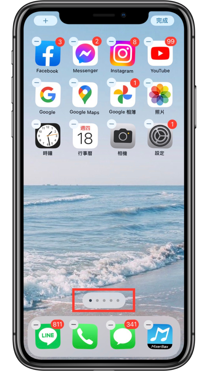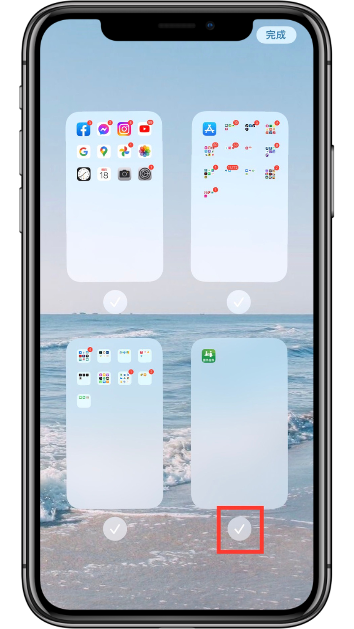 長按 iPhone 桌面空白處 -> 點選底部的「圓點」-> 將想取消隱藏的頁面勾選起來並點選「完成」即可。