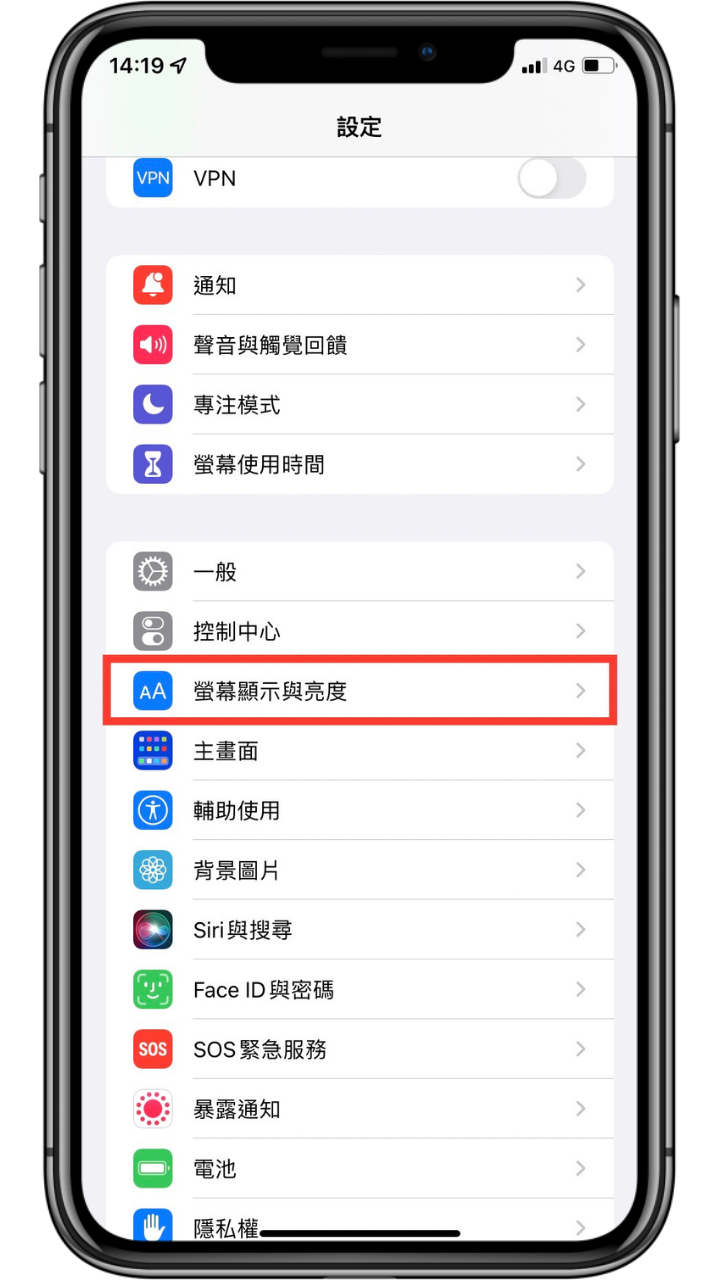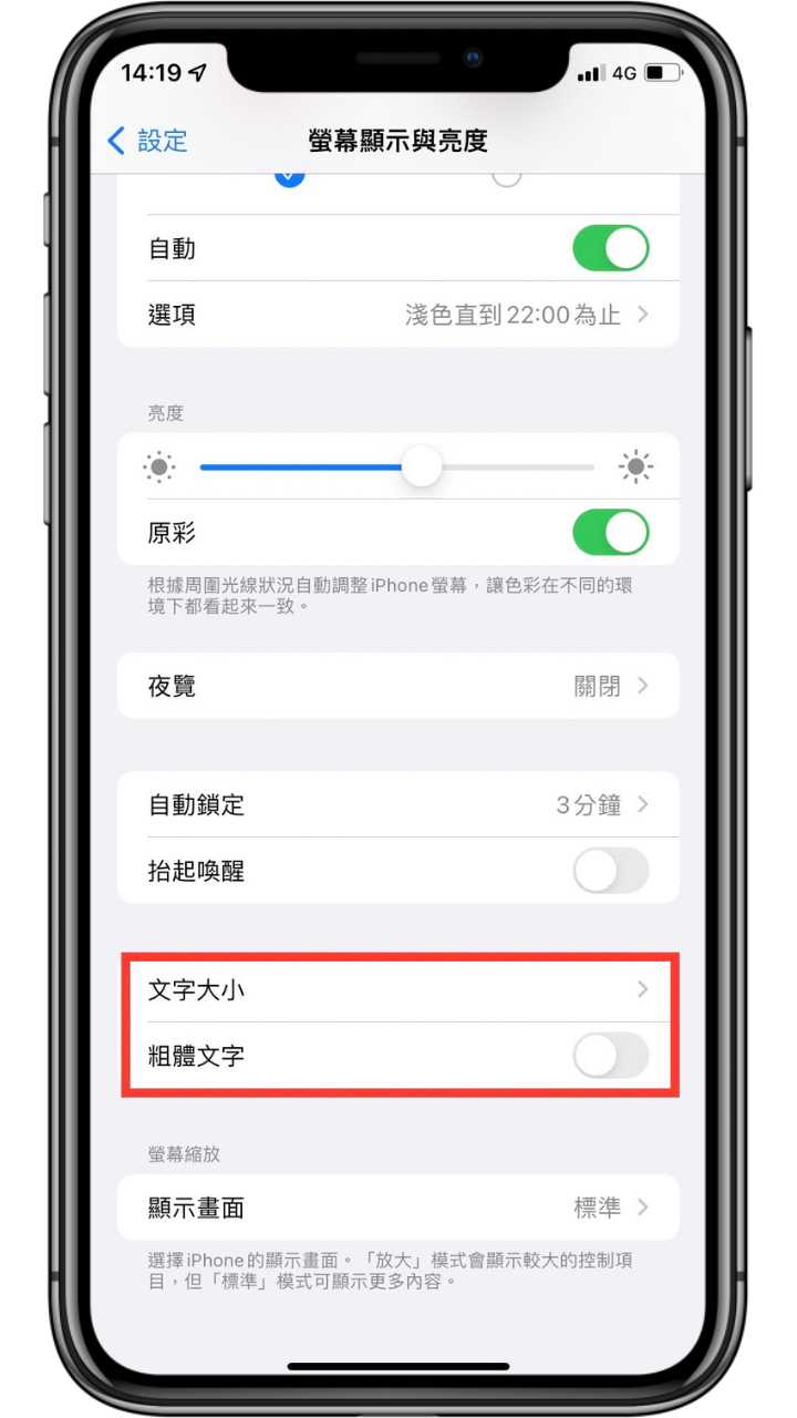 開啟 iOS「設定」-> 點選「螢幕顯示與亮度」-> 下滑即可找到「文字大小」及「粗體文字」兩種選項