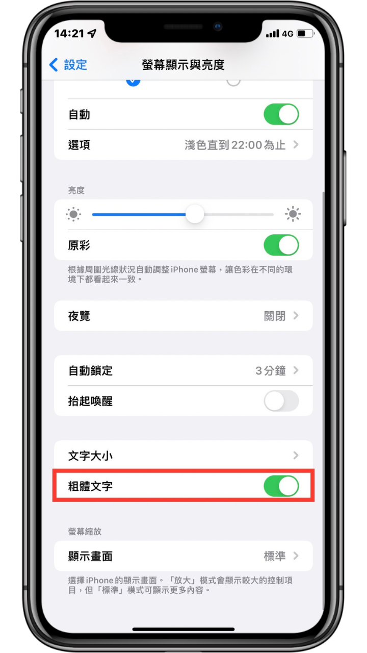如果想要想要讓 iPhone 手機字體變粗的話,將「粗體文字」開啟即可。