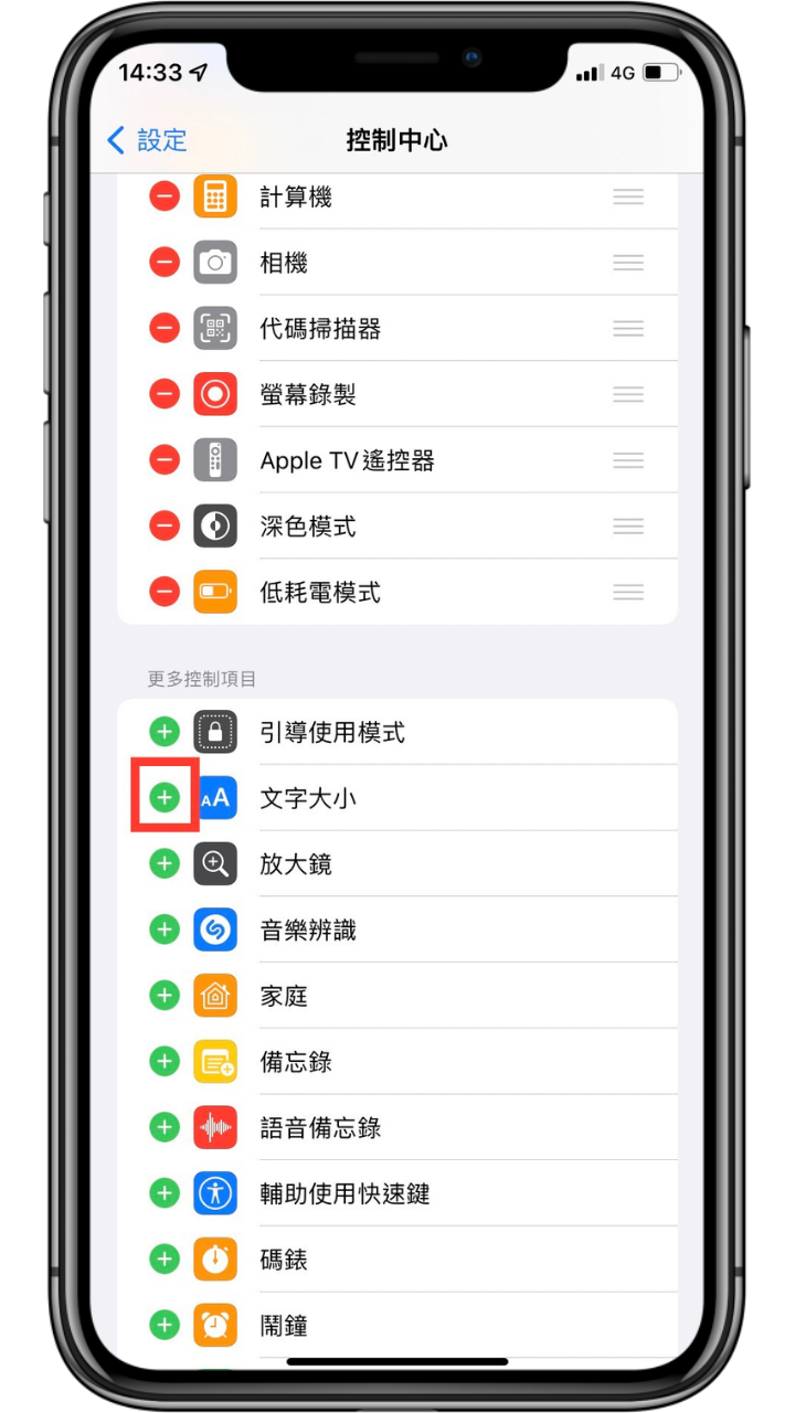 開啟 iOS「設定」-> 點選「控制中心」-> 下滑找到「文字大小」並且點選左方「+」按鈕。