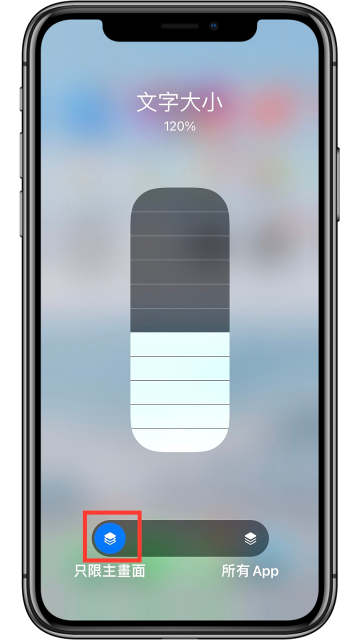 如果想要單獨調整 iPhone 主畫面的文字大小,只要點選下方「只限主畫面」的按鈕即可(圖示變藍色)單獨調整 iPhone 主畫面的文字大小。