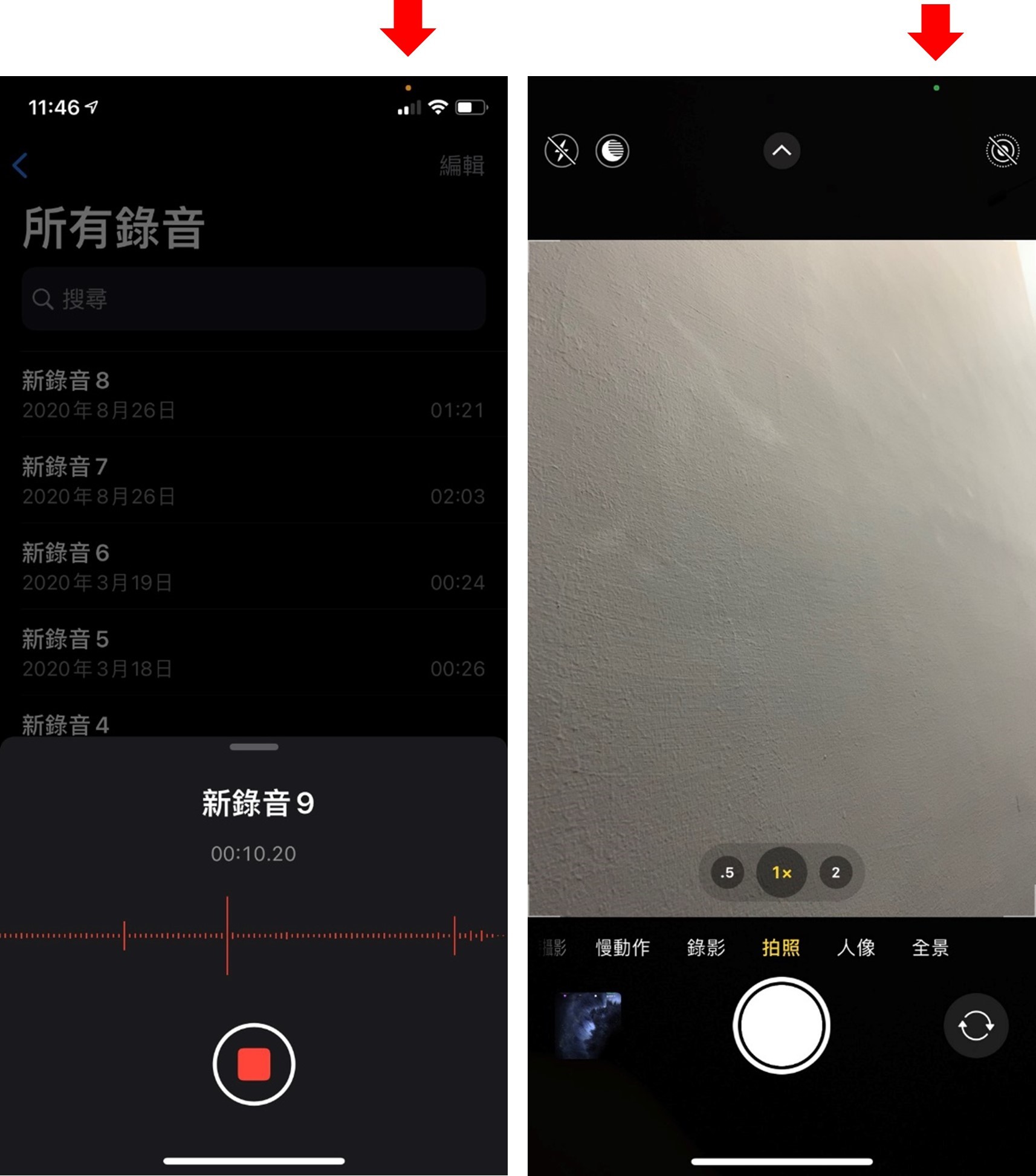 特別注重隱私的iPhone為了保護使用者,特別在右上角加入顯示LED燈的功能,綠點代表相機開啟;而橘點代表麥克風啟用,這樣就能巧妙地提醒不知情的使用者了。