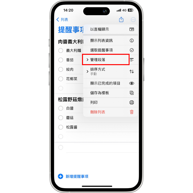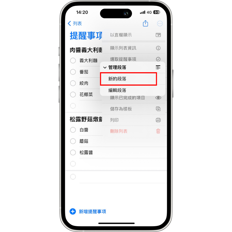 這次全新的段落功能能為各個事項分類,能更加清楚地為圖中的購買清單分類,操作方法:點擊「•••」-->「新的段落」