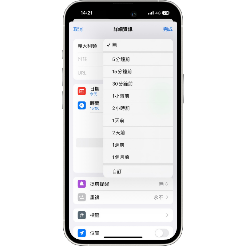 提前提醒功能可以在特定日期的提醒事項到期前收到通知,讓我們能夠預先安排即將到來的任務或事件,有足夠的時間來準備和計劃。可以根據自己的需要選擇自定義的時間範圍,可以是1天、1週、1個月。