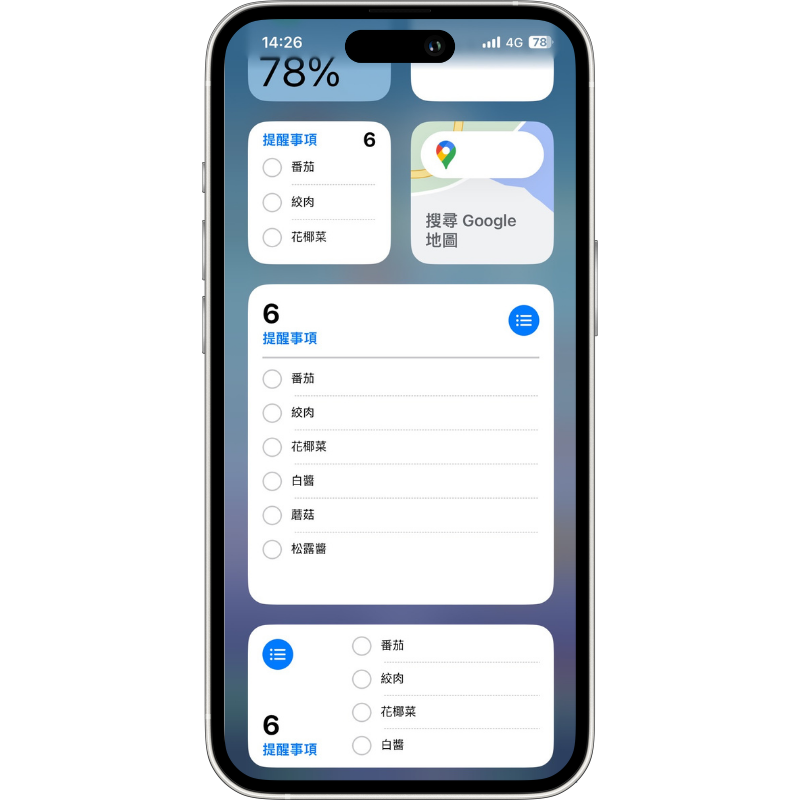 新功能看讓我們能在主畫面看提醒事項列表時不需要進入應用程式,能夠更迅速地翻閱和處理重要的提醒事項。