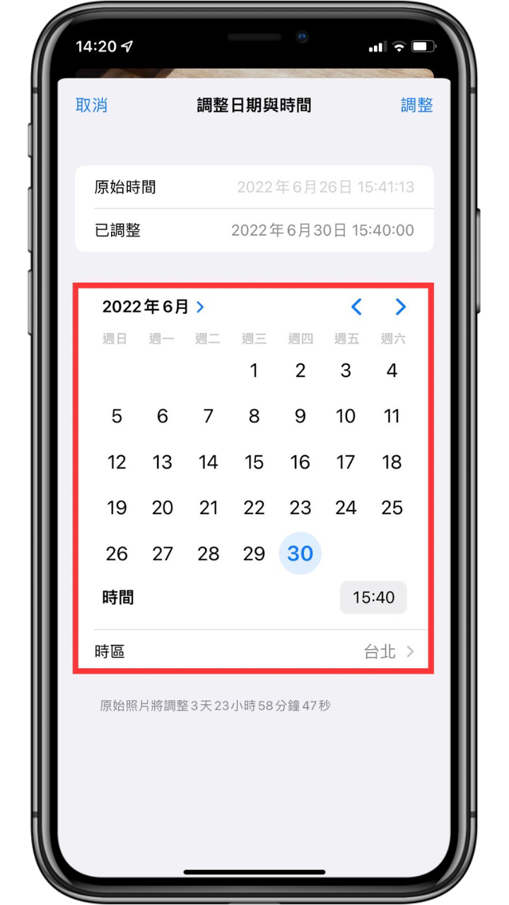開啟照片APP中的相片或影片 -> 點擊下方資訊圖示「 i 」-> 點擊時間欄位右方的「調整」,就可以在下方日曆表調整日期與時間 -> 完成後點選右上角「調整」即可。