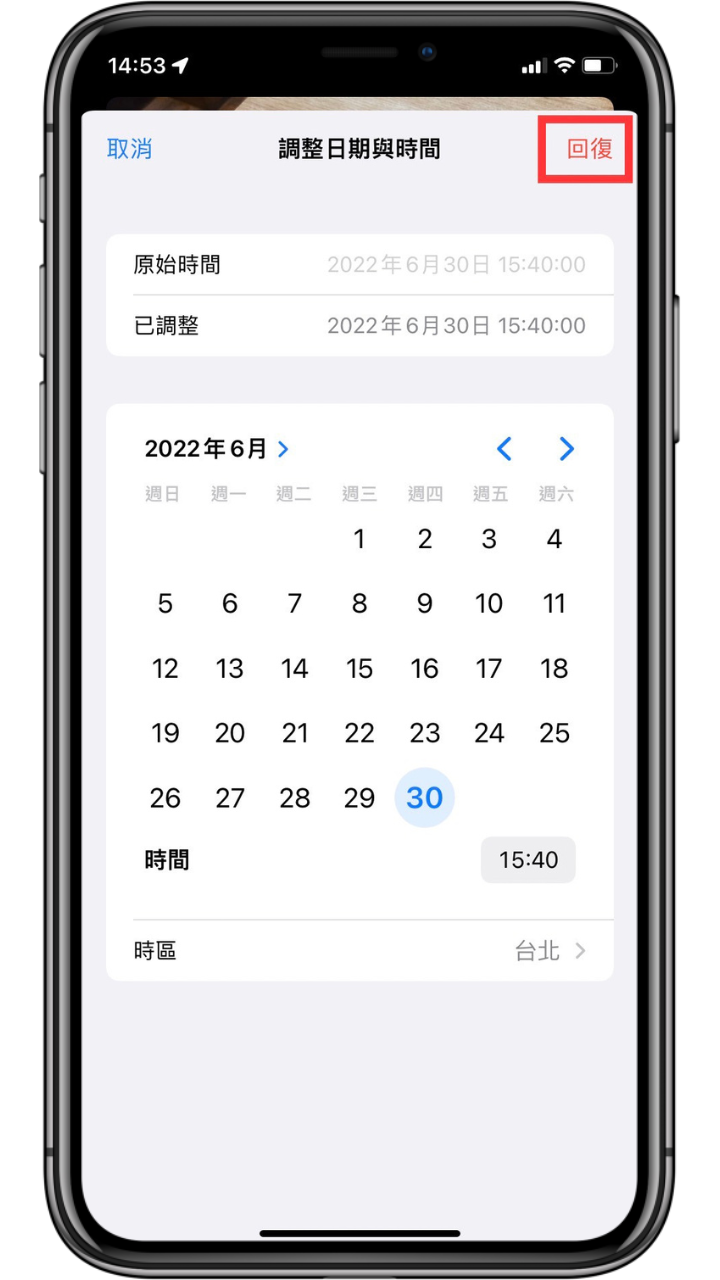 一樣開啟該張照片,並且點擊下方資訊圖示「 i 」-> 點擊時間欄位右方的「調整」-> 點擊右上角「回復」即可將照片的原始時間復原。