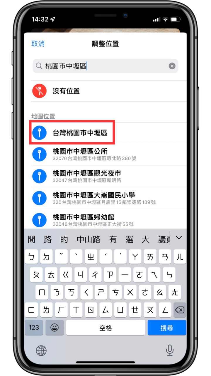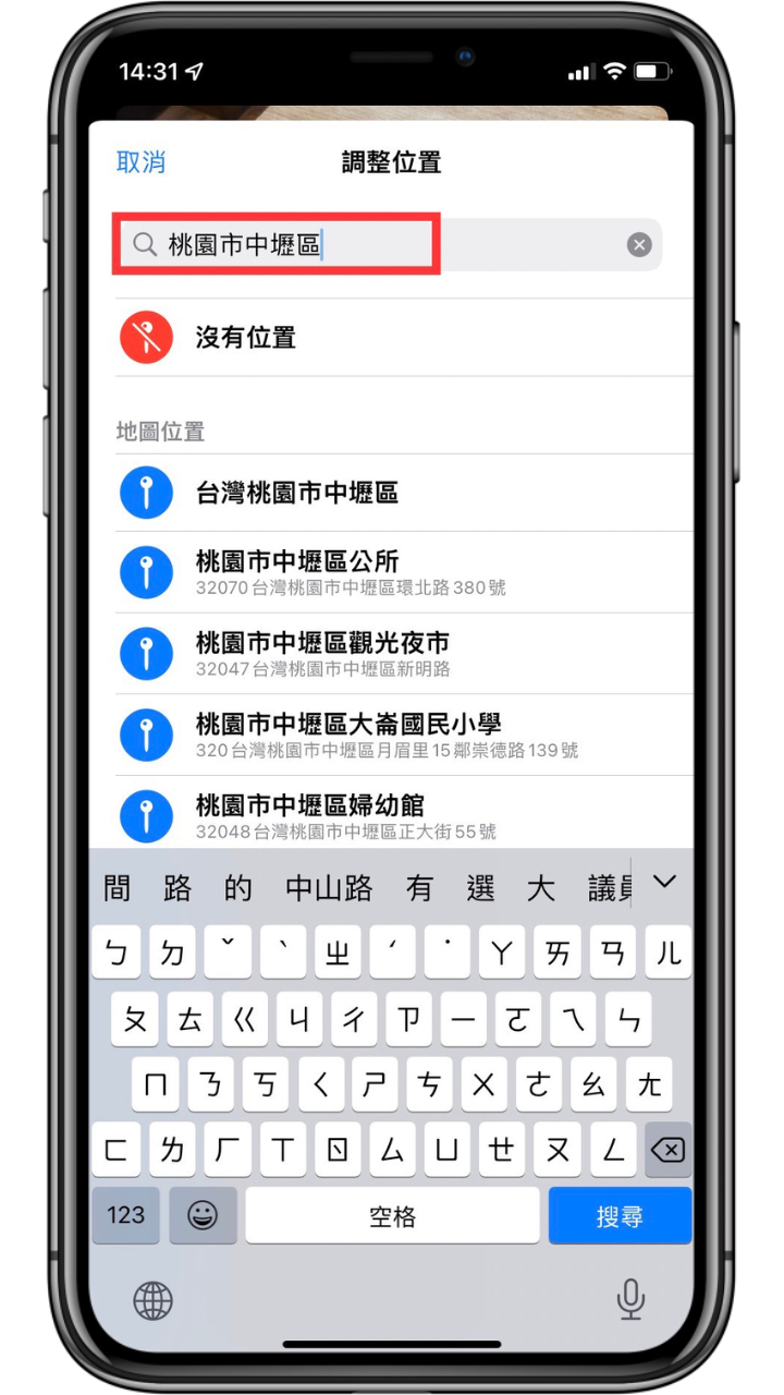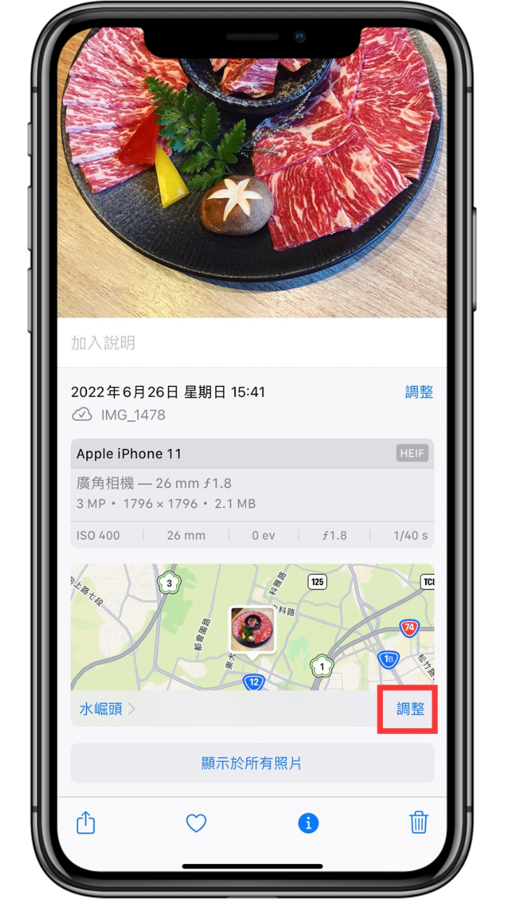 開啟照片 APP 中的相片或影片 -> 點擊下方資訊圖示「 i 」-> 下滑點擊地圖右下方「調整」-> 在上方輸入框輸入地址後,點擊下方地圖位置的選項,即可更改照片的拍攝地點。
