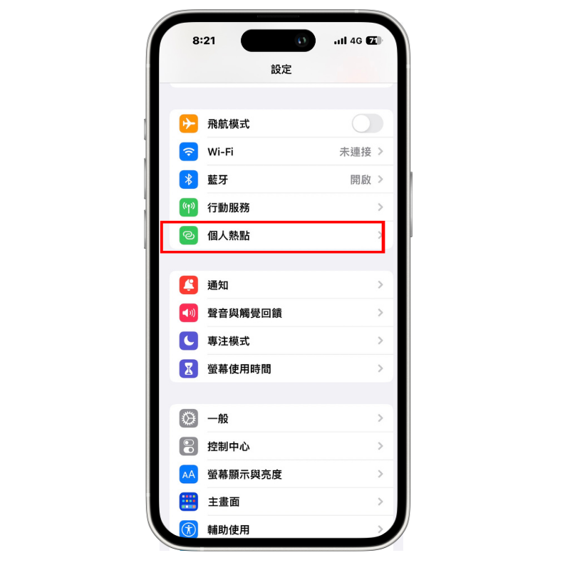 在iOS中,前往「設定」>「個人熱點」,先將個人熱點功能關閉,然後再重新啟用。