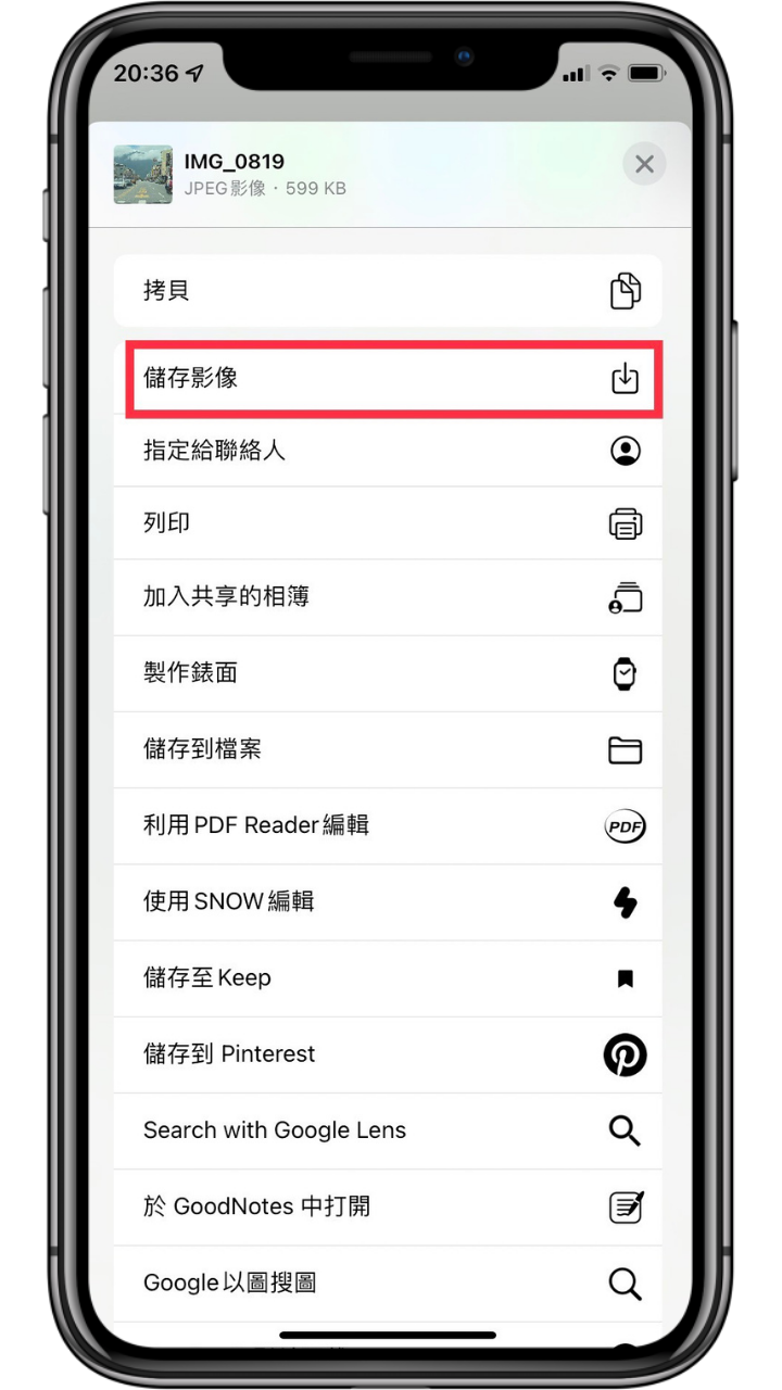 如果需要將照片存回「照片」APP裡,只要到備忘錄裡,點進所要儲存的照片 -> 點擊左下角「分享」圖示 -> 點選「儲存影像」,即可在「照片」APP裡找到該相片。