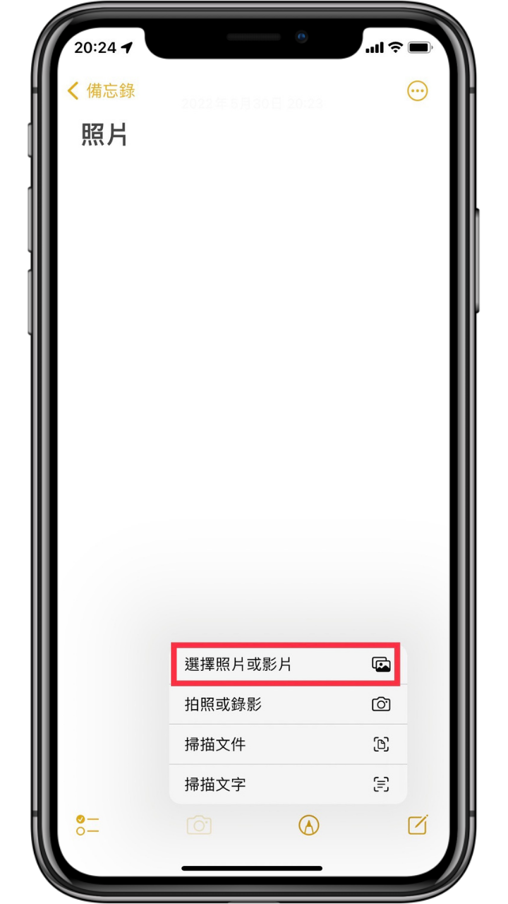 打開「備忘錄」APP -> 點擊右下角新增備忘錄,並且輸入標題 -> 點擊下方「相機」圖示 -> 點選「選擇照片或影片」-> 將所要隱藏的照片選起來,並且點擊右上角「加入」。