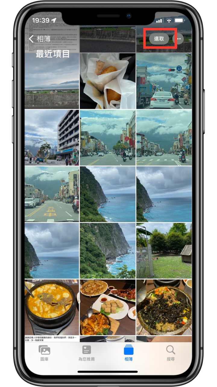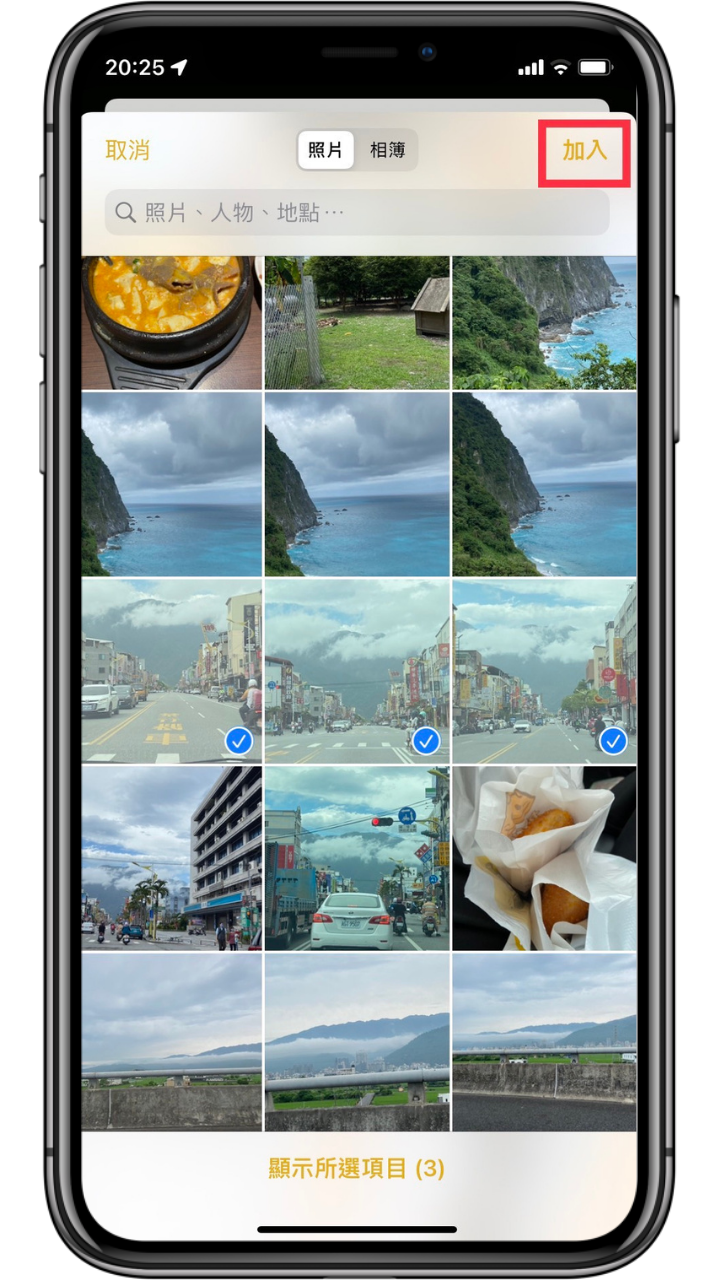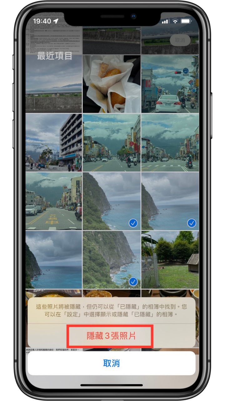 打開「照片」APP -> 點擊右上角「選取」,將所要隱藏的照片打勾 -> 點擊左下角「分享」圖示 -> 下滑找到「隱藏」-> 點選「隱藏N張照片」即可。
