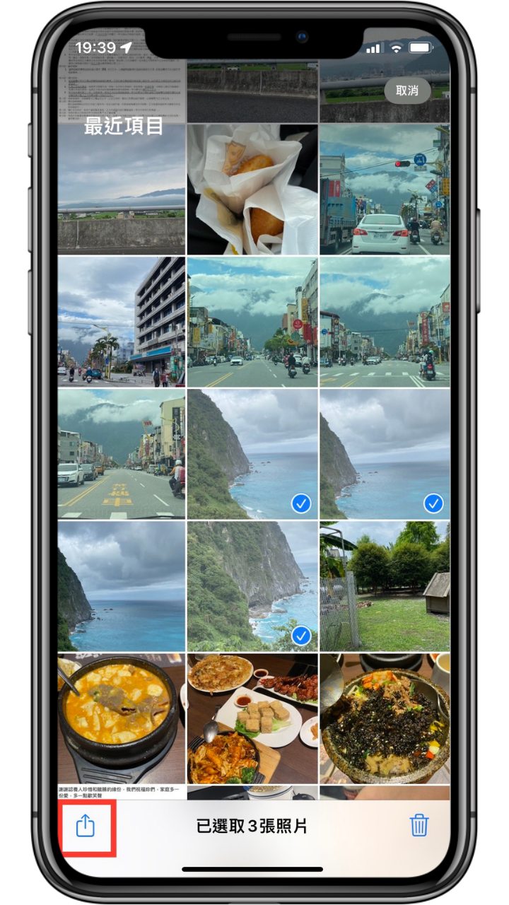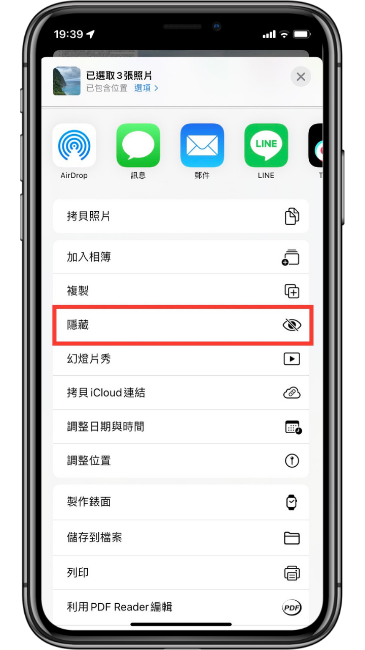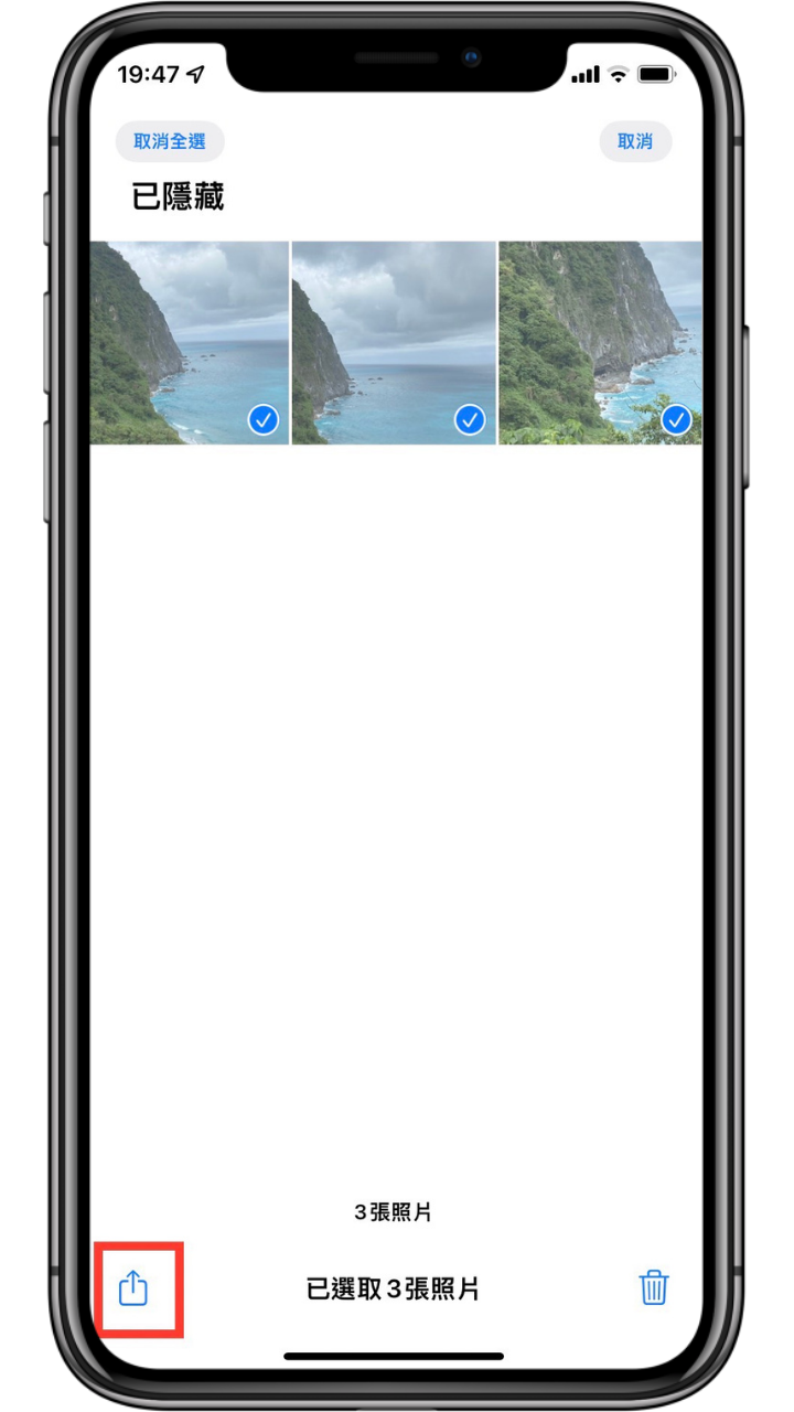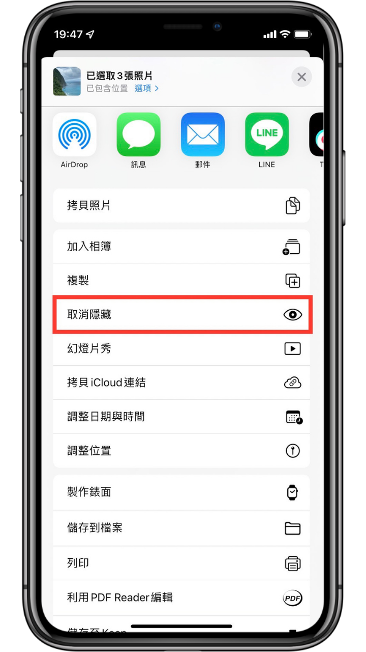 如果想要將相片取消隱藏,只要點進去「已隱藏」的相簿裡,用上面同樣的方法將相片選取,並且擊左下角「分享」圖示 -> 下滑找到「取消隱藏」即可。