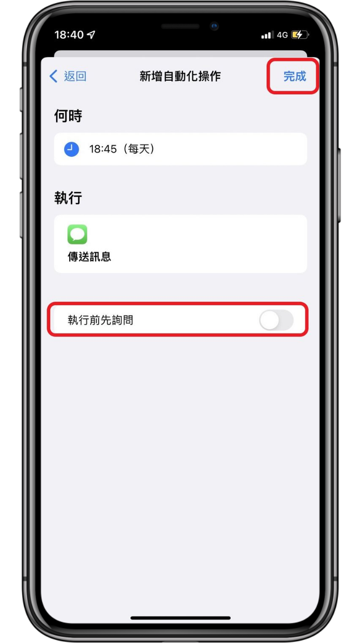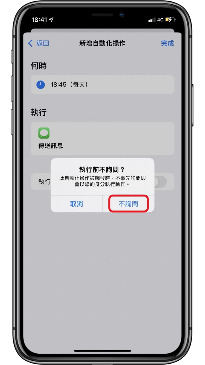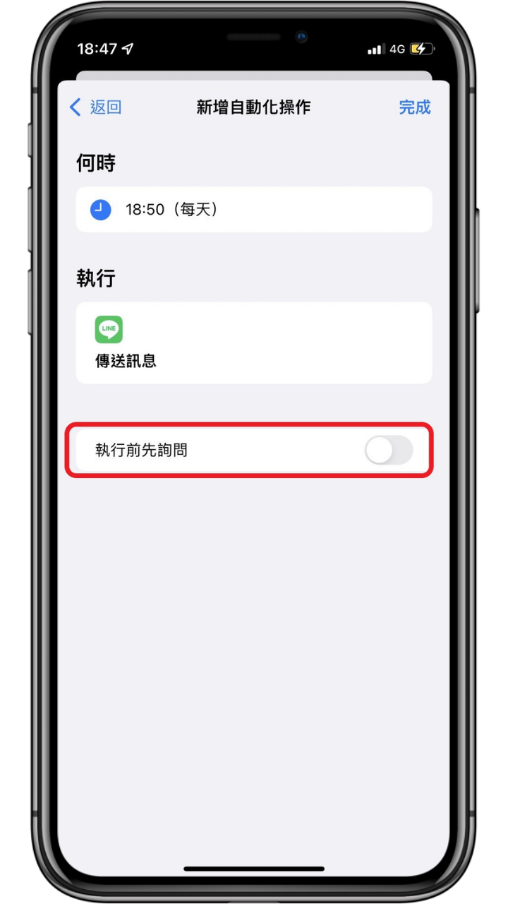 將「執行前先詢問」關閉,即可點擊右上角「完成」,接下來時間到了之後就會自動傳訊息了喔~