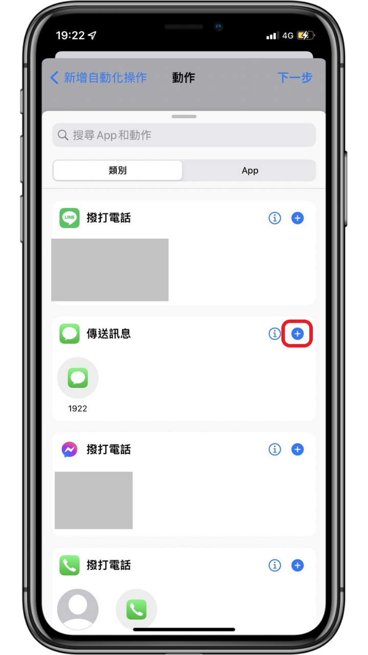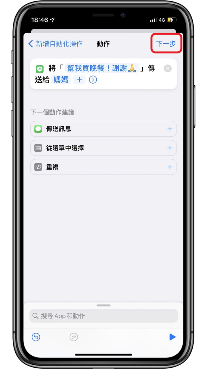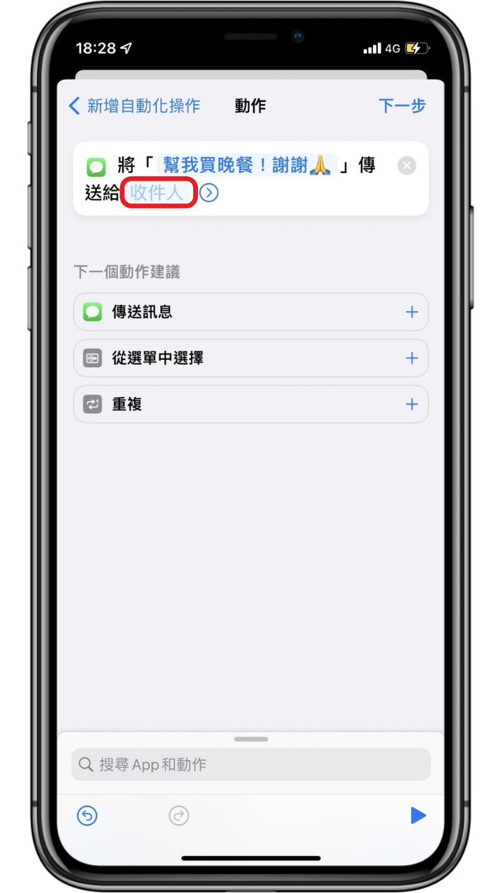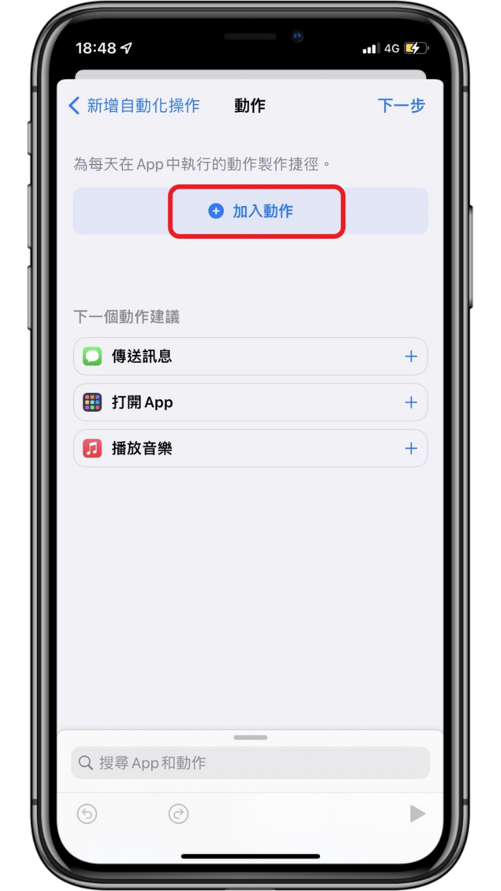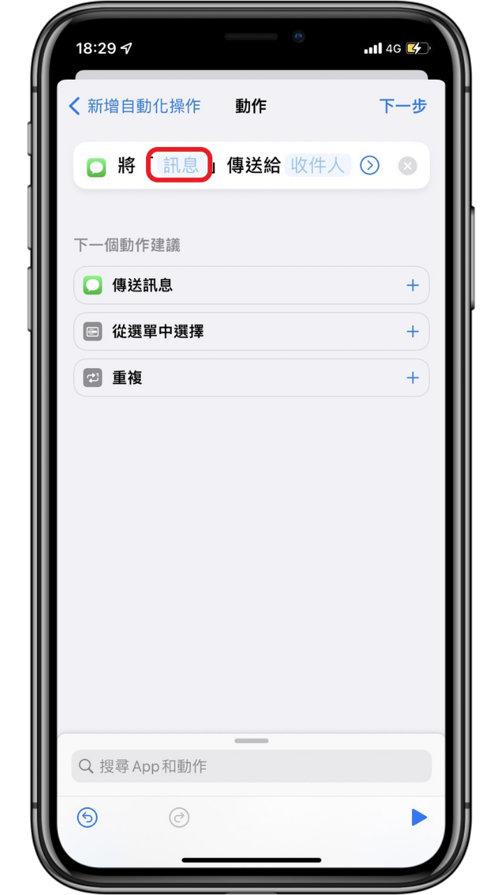 可點選「加入動作」或是上拉下方的「搜尋App和動作」-> 找到 iMessage的圖示(傳送訊息),並點擊右方的「+」
