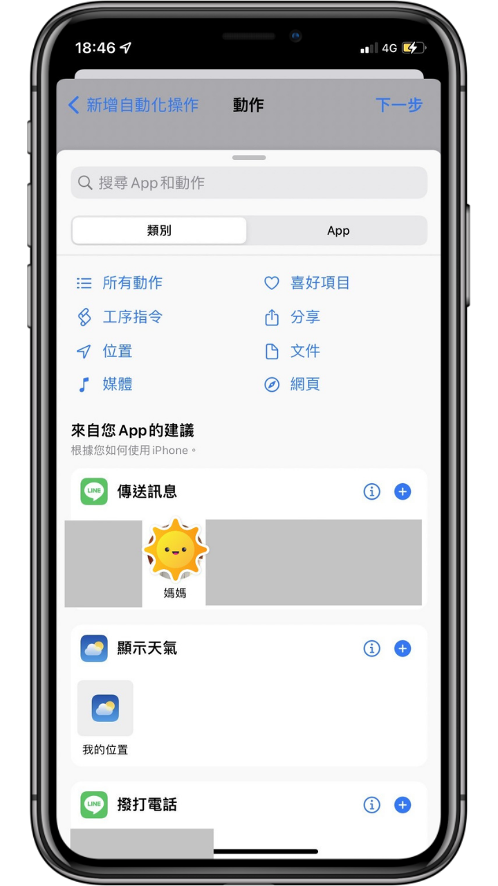 可點選「加入動作」或是上拉下方的「搜尋App和動作」-> 找到Line的圖示(傳送訊息),並點擊想要傳送訊息的對象的頭貼