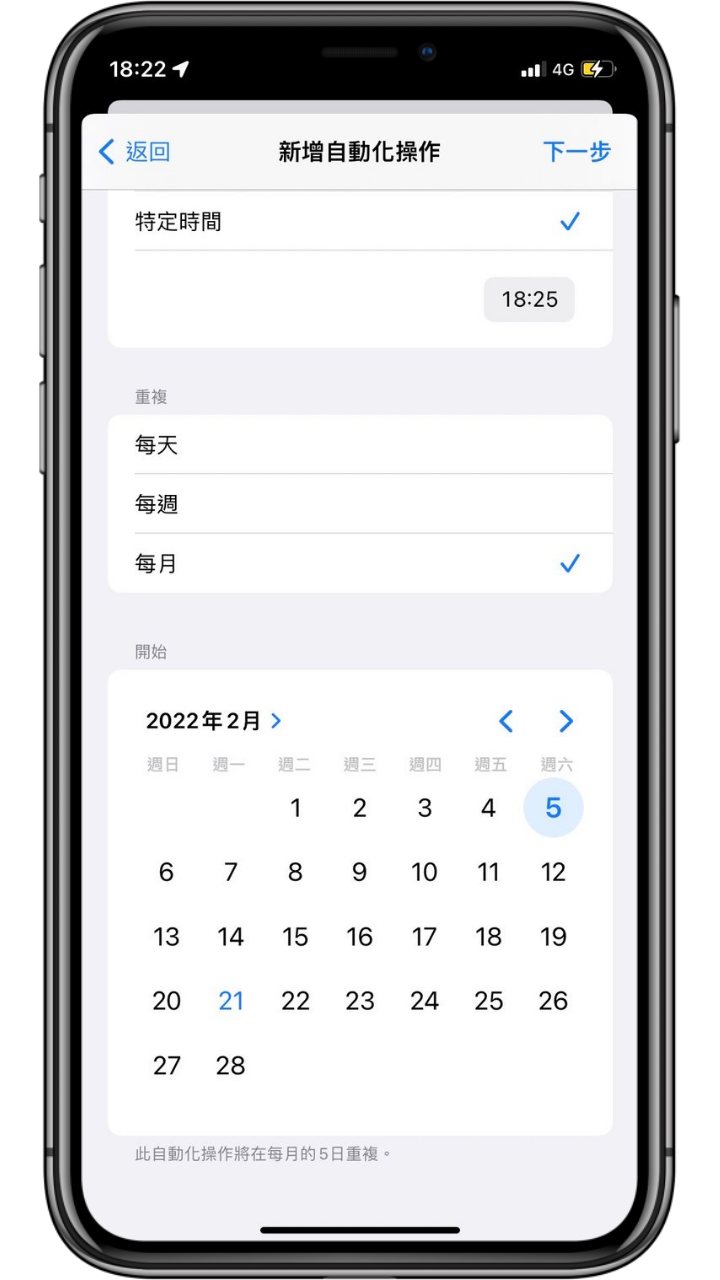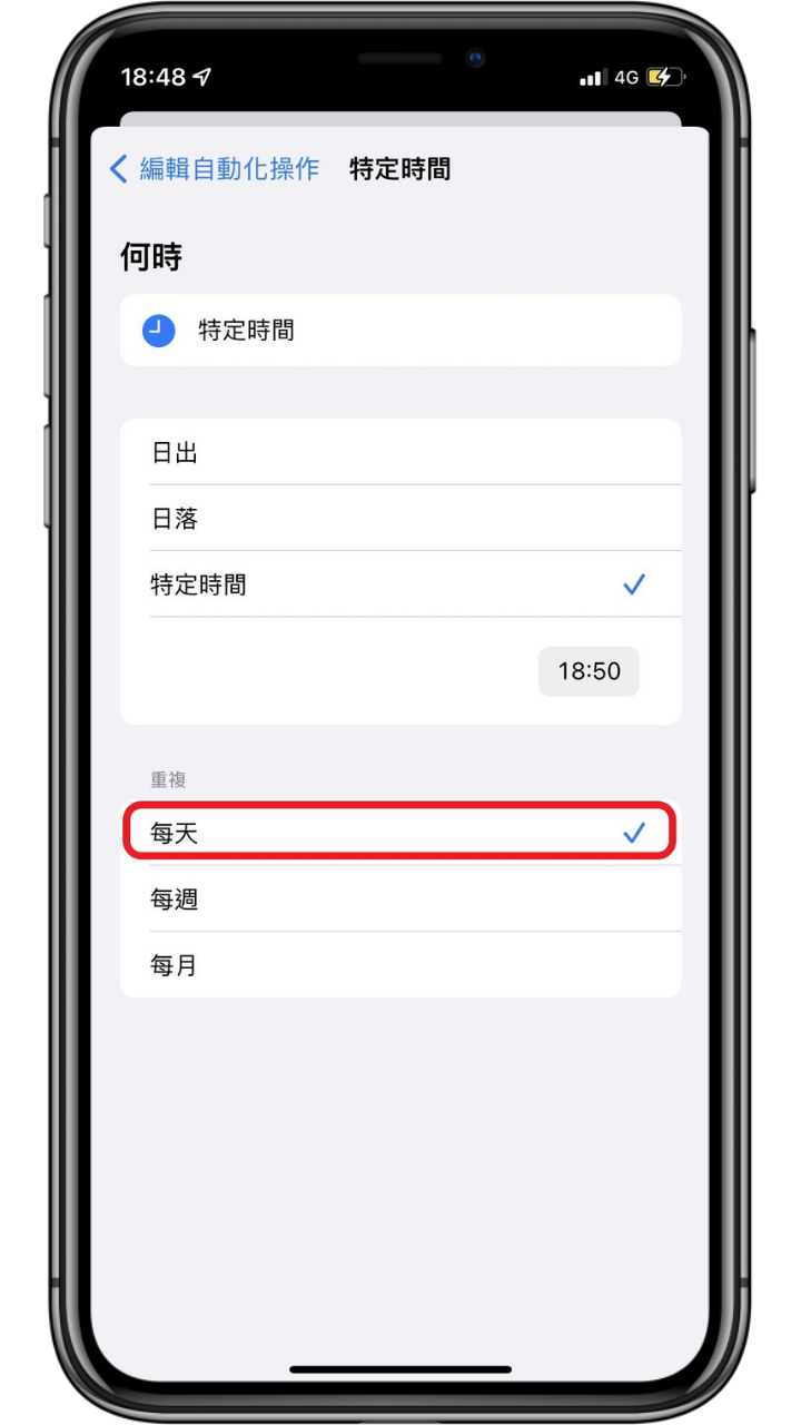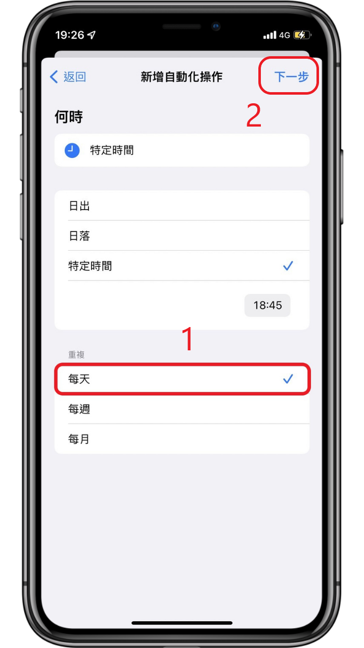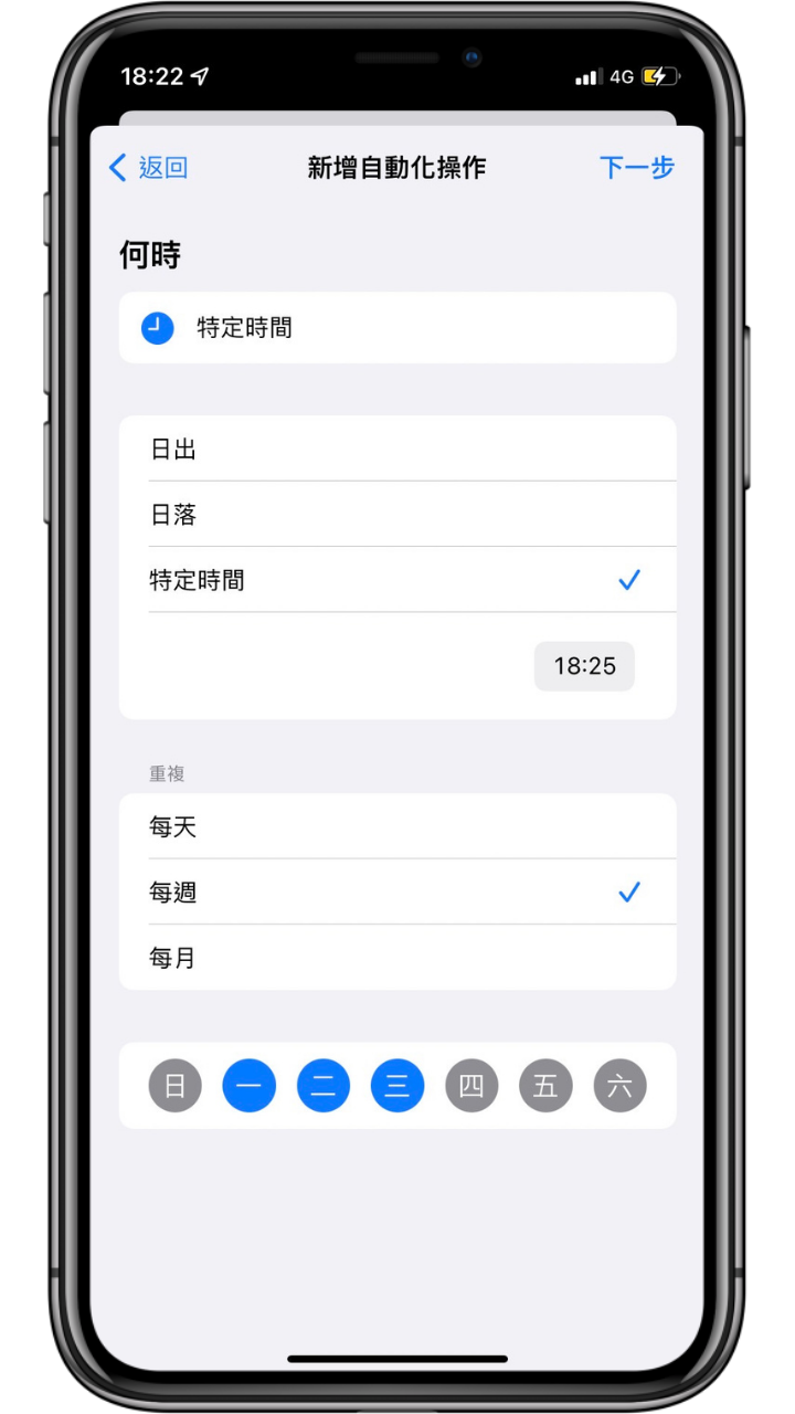 可依照自己的需求設定「日出、日落」或「時間」還有重複的頻率,這邊小編示範的是「每天」,設定完後點擊右上角「下一步」