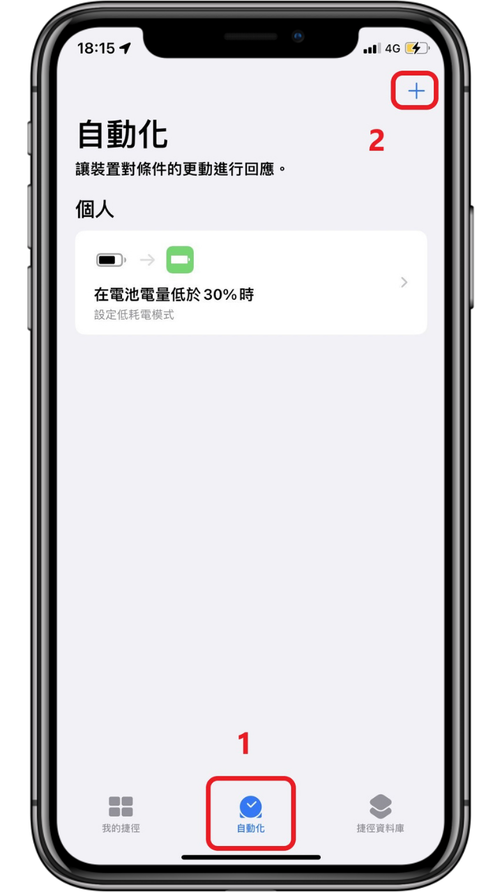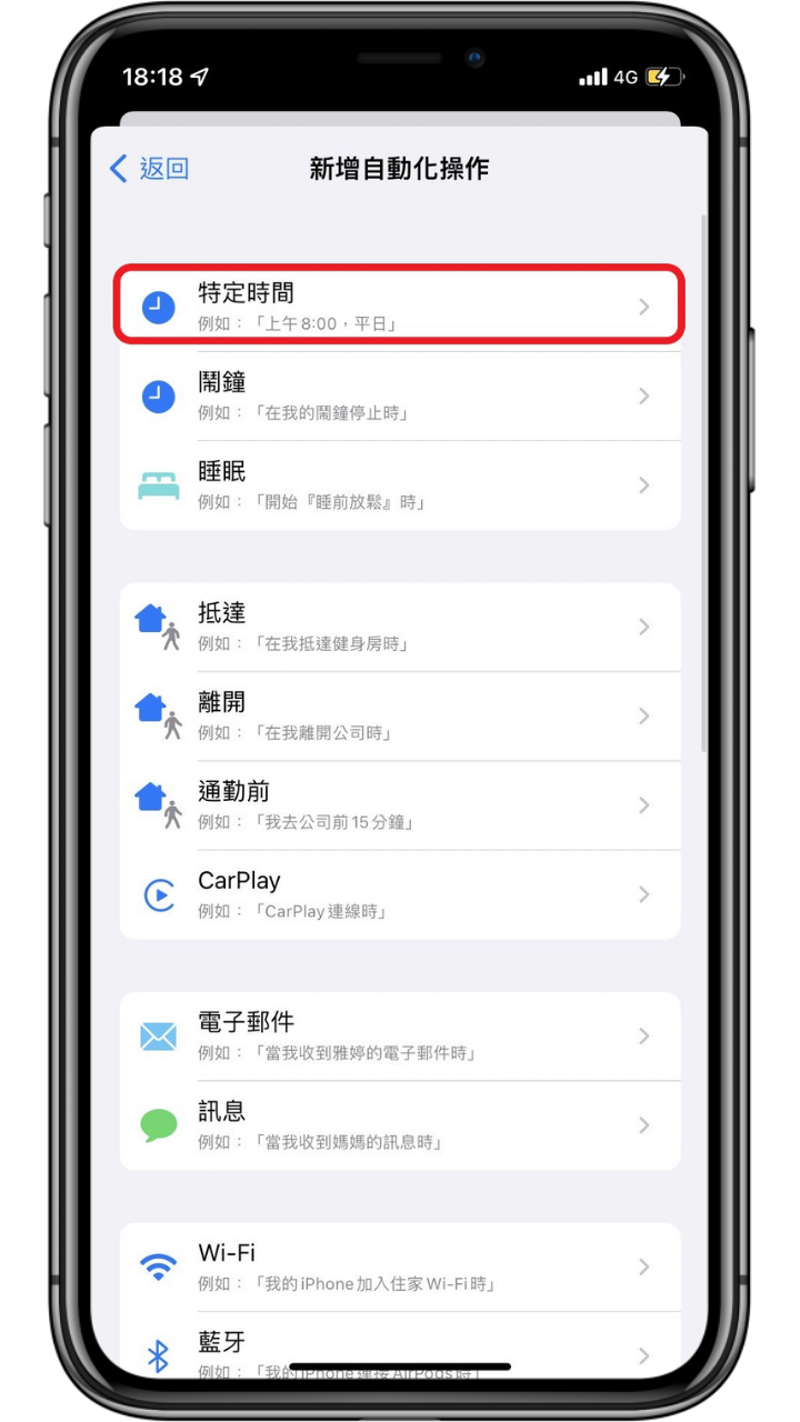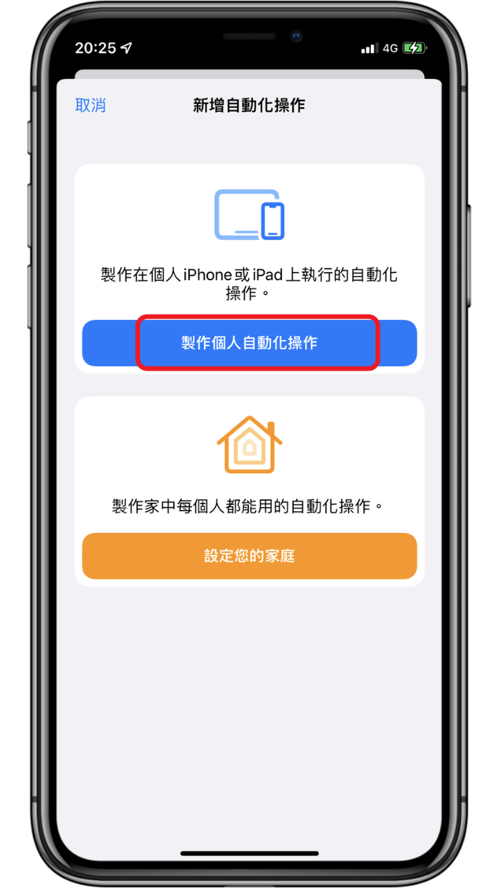 一樣先打開「捷徑」APP -> 切換至中間的「自動化」頁面,並點選左上角的「+」-> 點選「製作個人自動化操作」-> 點選「特定時間」