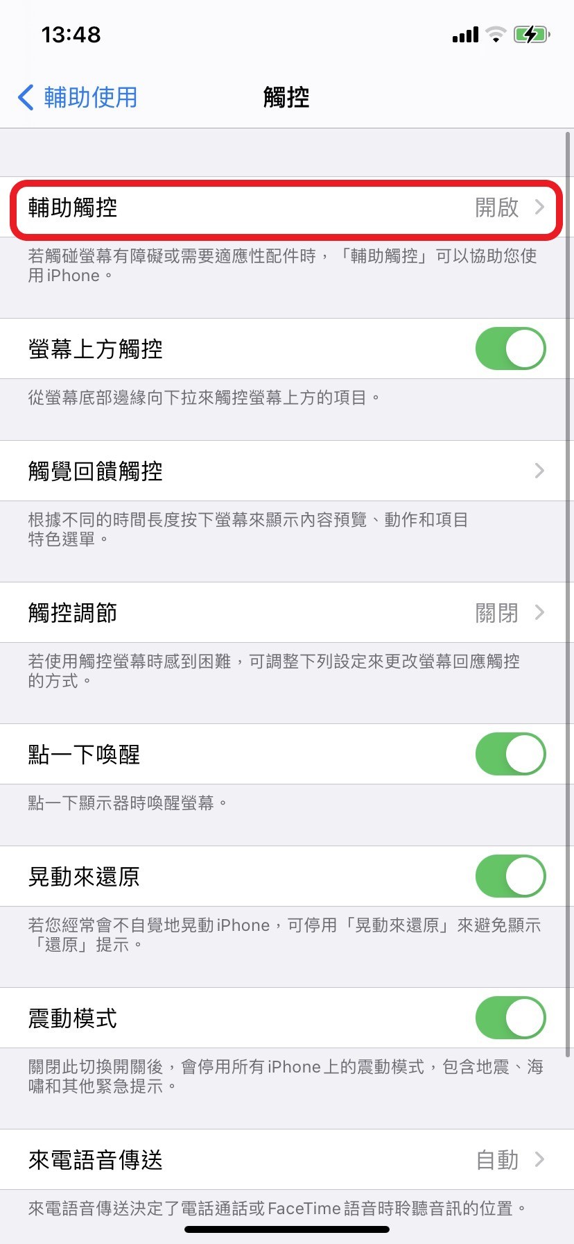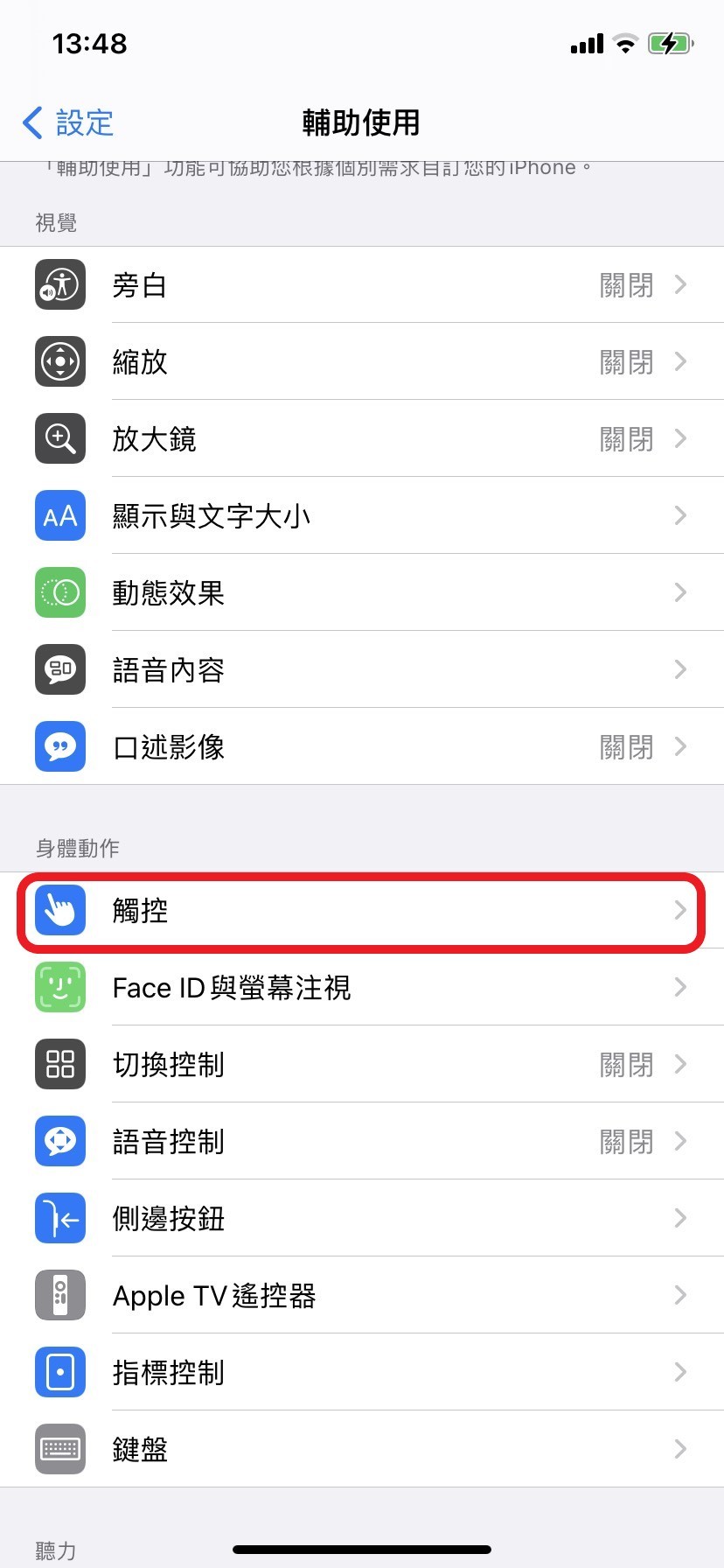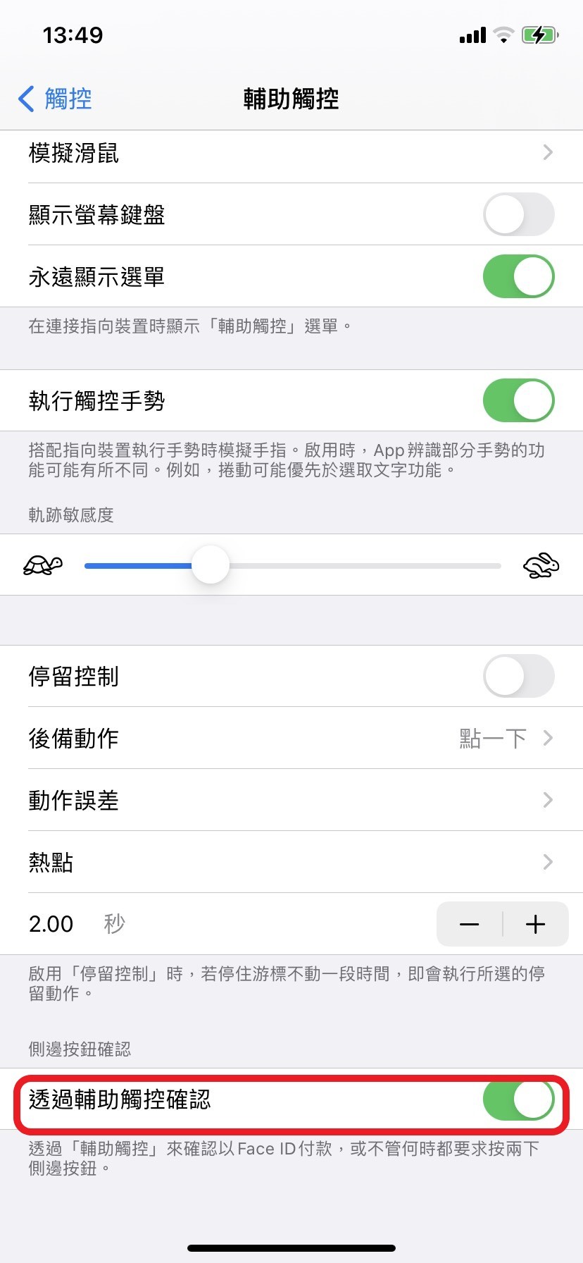 再至「設定」->「輔助使用」->「觸控」->「輔助觸控」->滑到最底部,開啟「透過輔助觸控確認」