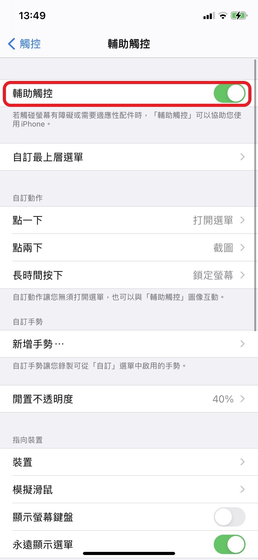 「設定」->「輔助使用」->「觸控」->「輔助觸控」-> 開啟「輔助觸控」