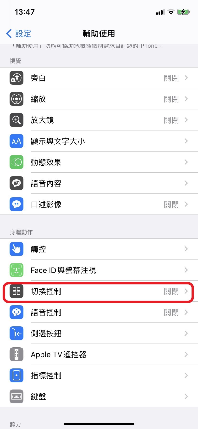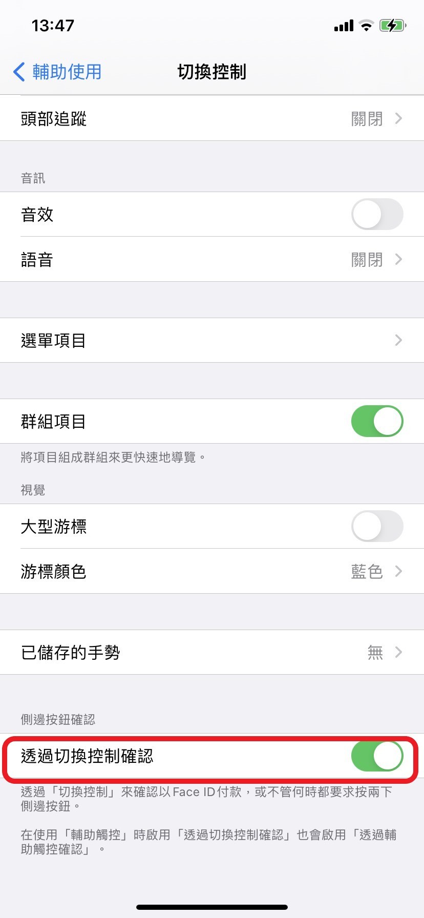 先至「設定」->「輔助使用」->「切換控制」->滑到最底部,開啟「透過切換控制確認」