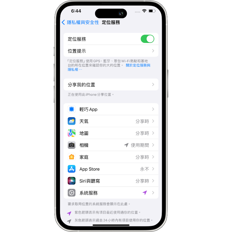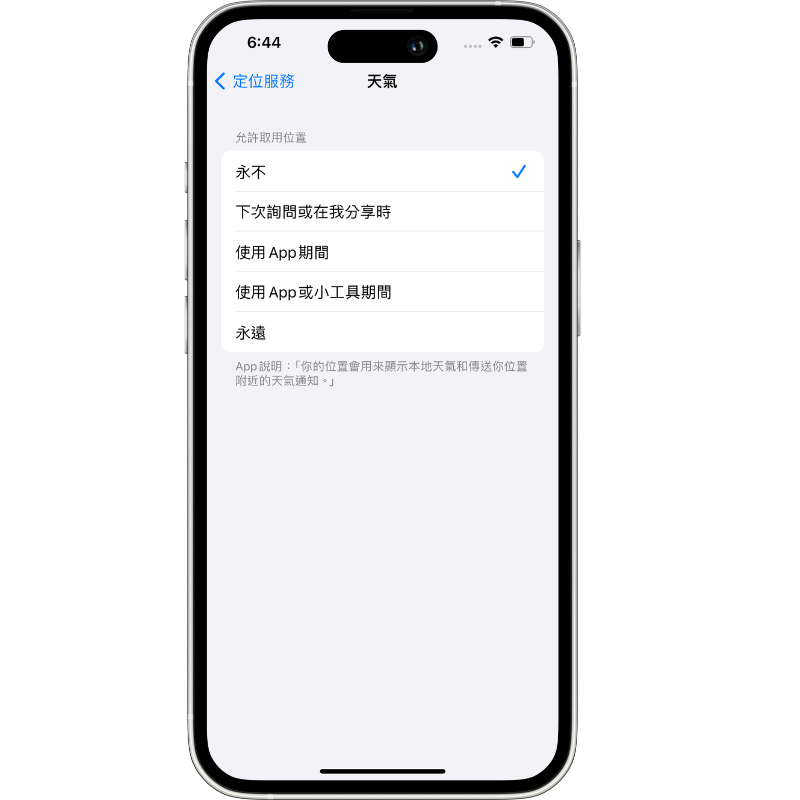 iPhone裡有許多App其實根本不需要使用定位功能,為了節省電力,建議把這些App的定位功能關閉。只需到「設定」>「隱私權」>「定位服務」,選擇不必要定位服務的 APP,將它們改成「永不」或是「使用App期間」,就能有效省電囉!