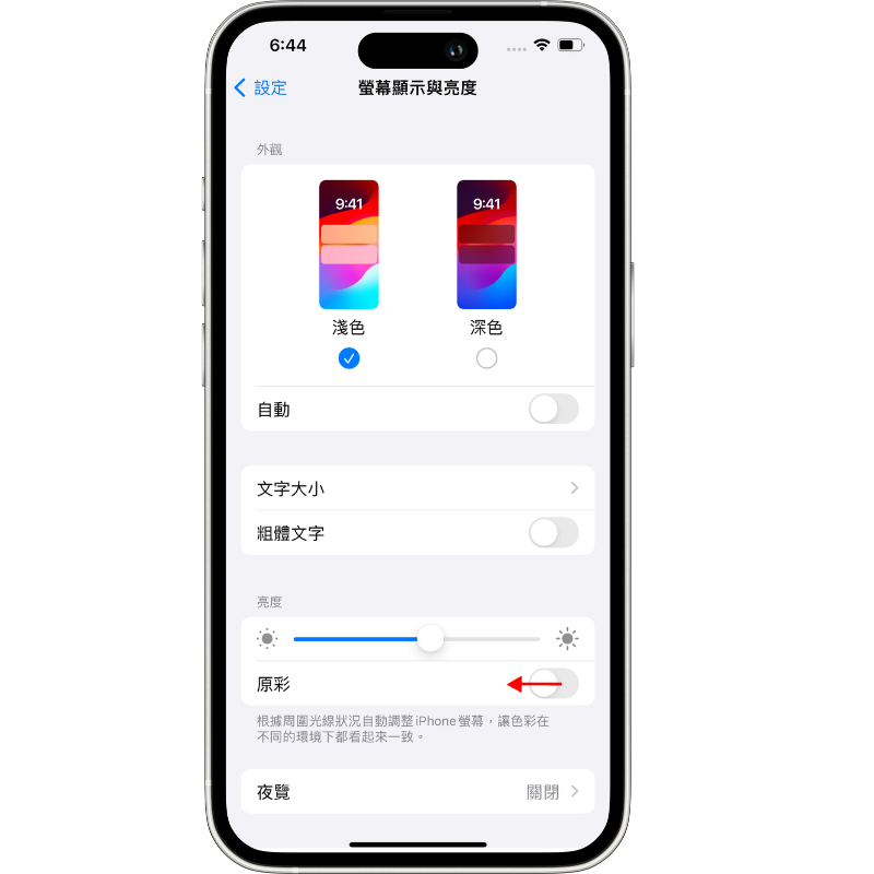在設定中,找到「螢幕顯示與亮度」,然後關閉「原彩」。另外,建議將螢幕亮度調整到中央位置,不僅有助於保護眼睛,還能節省電力。